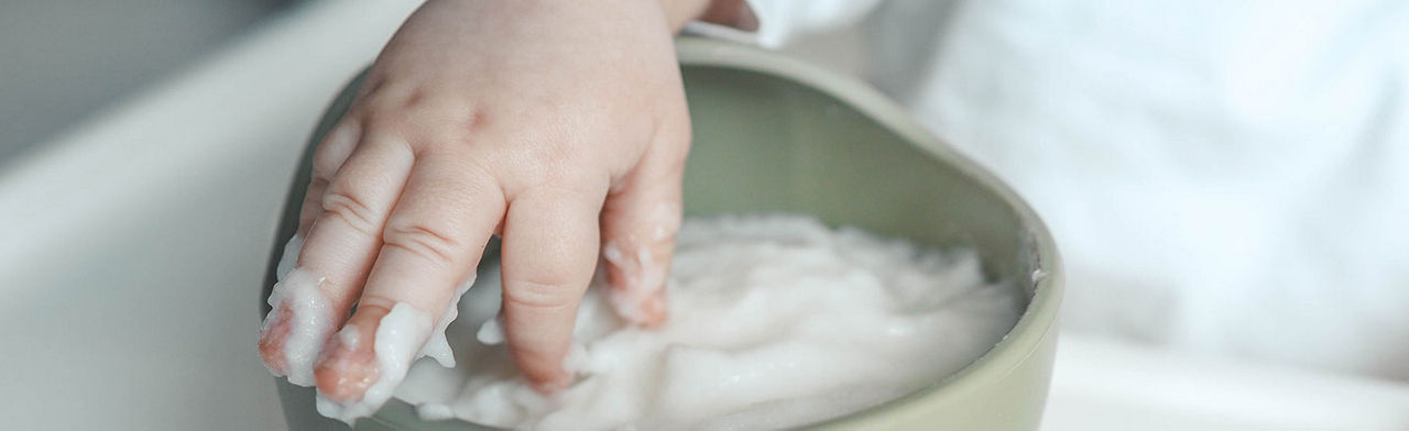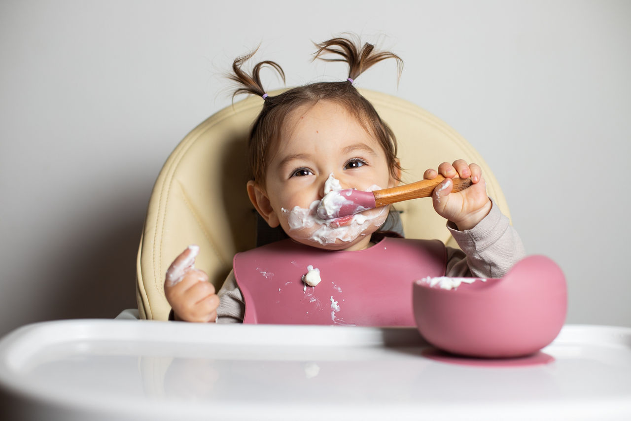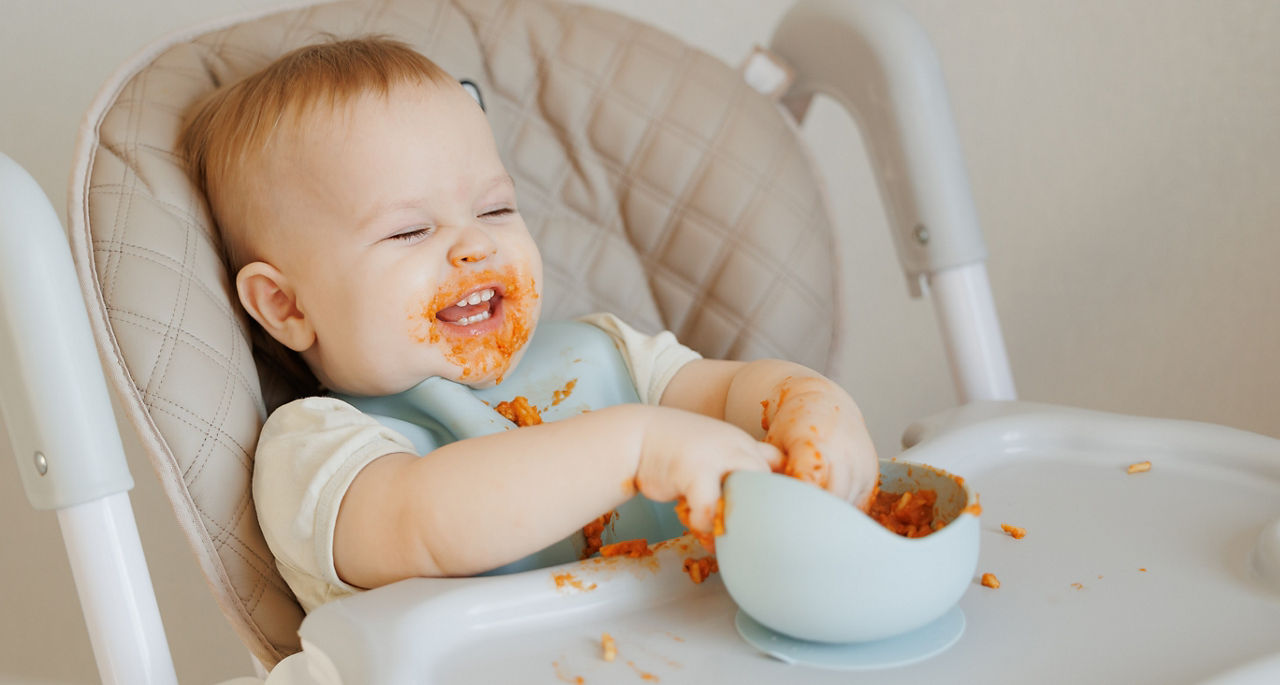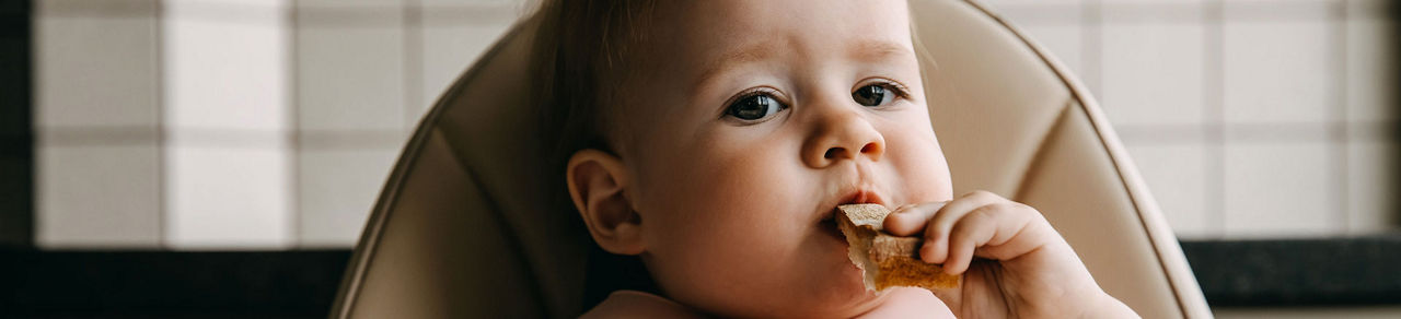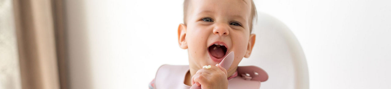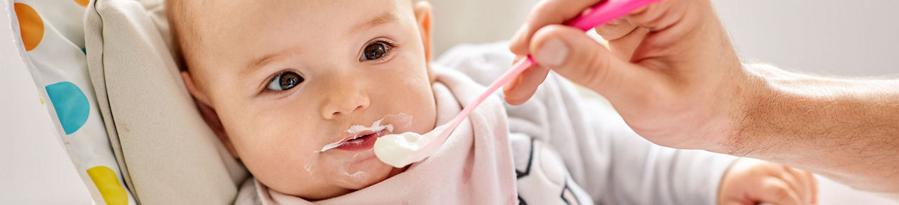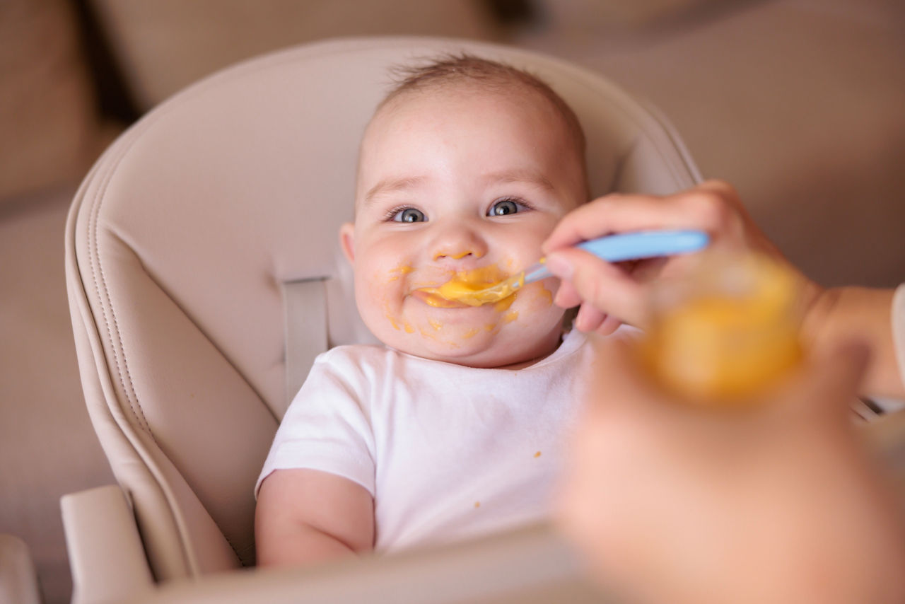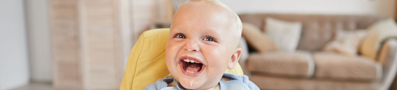 Avant toute chose, ce rappel : pour éviter tout risque de fausse route, votre bébé doit toujours manger assis bien droit, attaché dans une chaise haute adaptée à son âge et toujours sous la surveillance permanente d’un adulte.