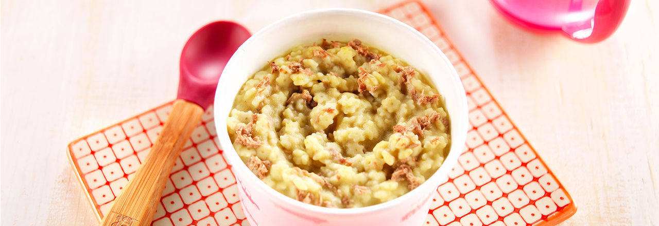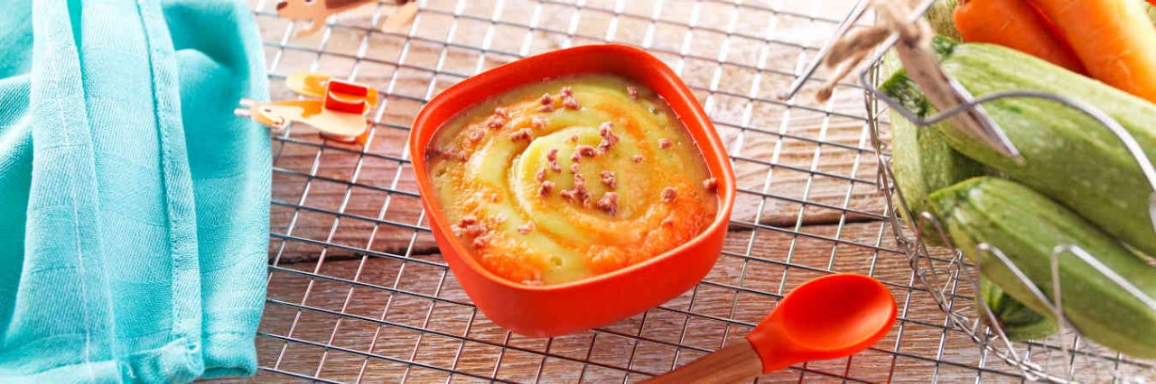 - Un plat composé d’un mélange de légumes et de féculents, servi en purée, ou en petits morceaux fondants, dans lequel vous ajouterez un filet d’un mélange d’huiles végétales ou, occasionnellement, une noix de beurre doux pasteurisé.