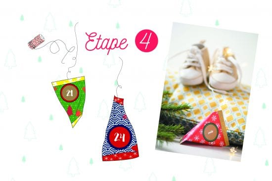 Percez un petit trou sur la bande du ruban adhésif coloré supérieure et glissez-y un bout de ficelle pour suspendre chaque berlingot sur un morceau de bois que vous aurez trouvé lors de vos promenades ou plus simplement sur un cintre. Votre calendrier de l’Avent est prêt !