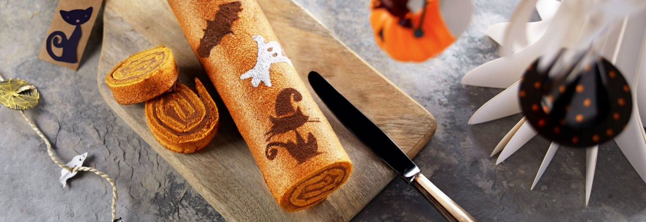 Ôtez le torchon et appliquez le pochoir (imprimez notre modèle) sur le roulé : saupoudrez de sucre glace pour réaliser un décor blanc et de cacao amer pour un décor foncé. Coupez une fine tranche pour bébé.