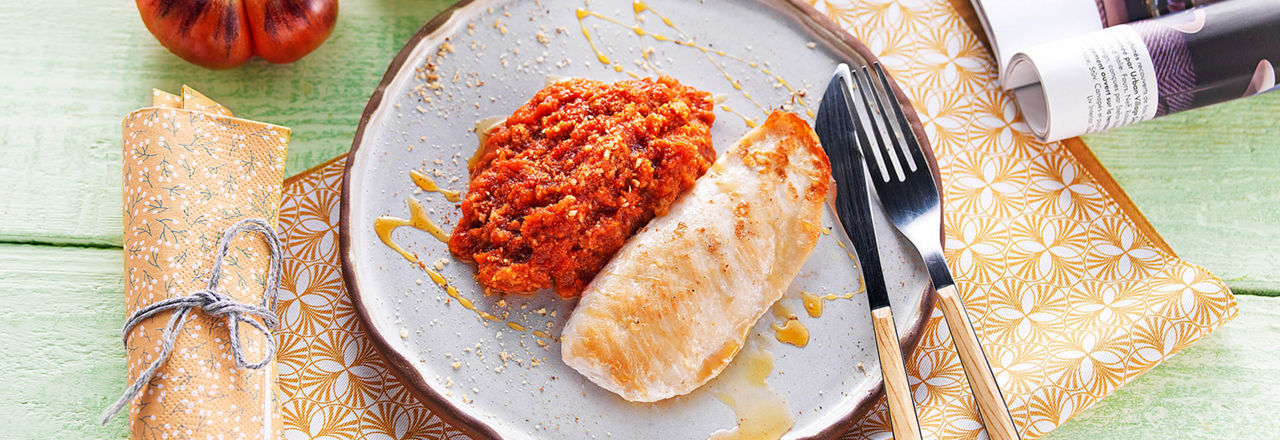 4- Servez les escalopes, ajoutez une touche de miel et la purée de tomates.