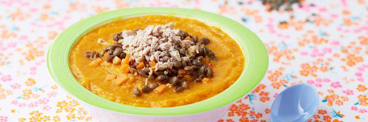 8. Dans une assiette creuse adaptée à bébé, versez au fond la purée de carotte et lentilles, et déposez par-dessus le filet mignon et servez.