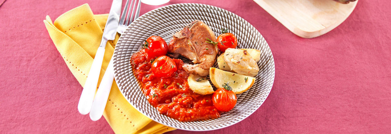 6- Dressez l’assiette avec la côte d’agneau, le fond d’artichaut et la purée de tomates.