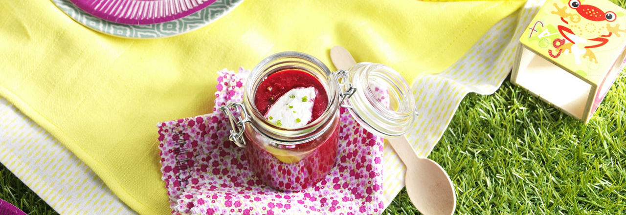 6- Dans un bol ou un verre, versez le gaspacho de betterave puis déposez la quenelle de crème de feta et ciboulette par-dessus.