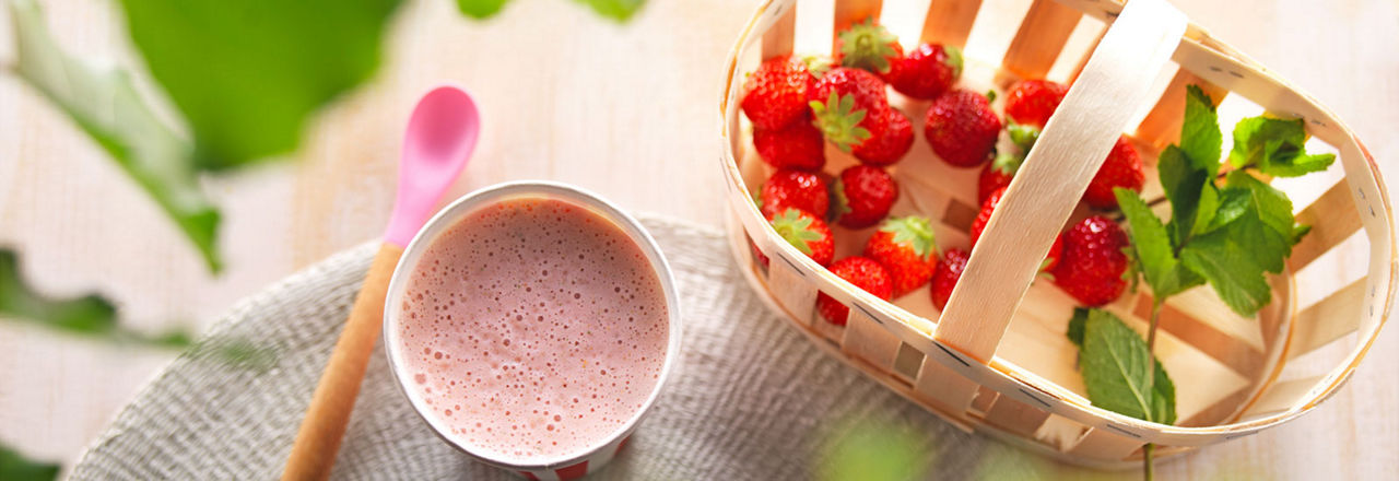 3. Dans un mixeur, versez le Blédilait 2ème âge, les fraises et la feuille de menthe préalablement lavée. Mixez le tout afin d’obtenir un mélange lisse et homogène.
