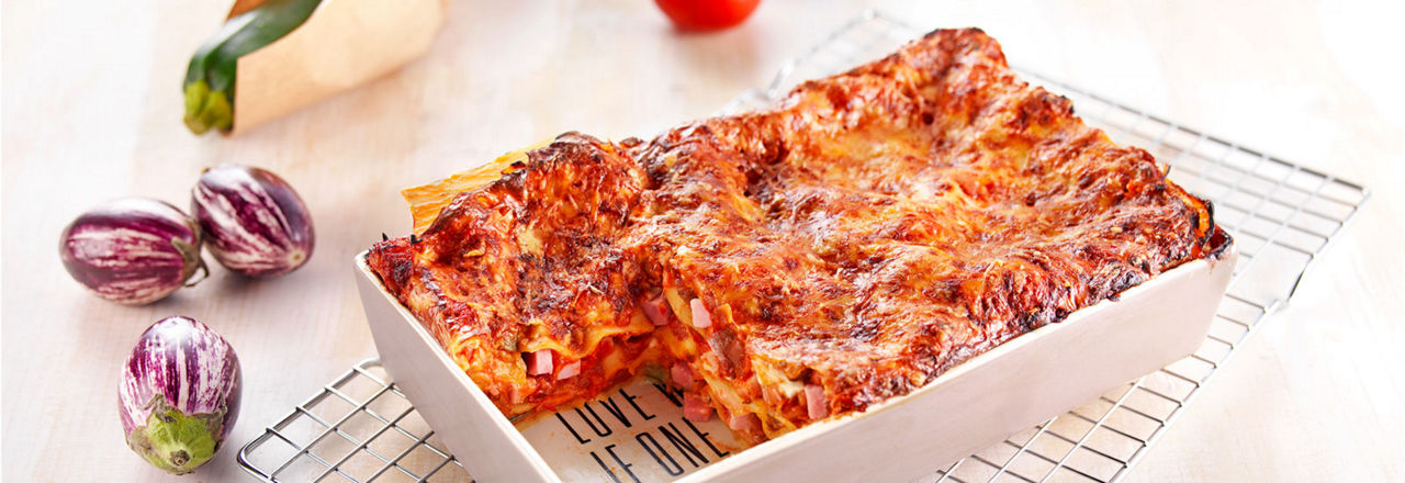 9- Dans un plat à gratin préalablement beurré, recouvrez le fond d’un peu de béchamel puis alternez les couches : plaque de lasagne – ratatouille – dés de jambon – béchamel.