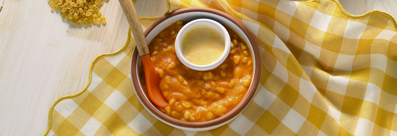 5. Réchauffez la purée de carotte Les Récoltes Bio, ajoutez les pâtes perles cuites et un filet d’un mélange d’huiles.