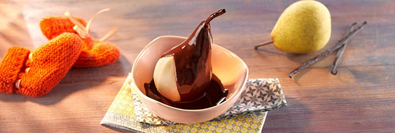 5- Dressez les poires dans des ramequins et nappez de chocolat.