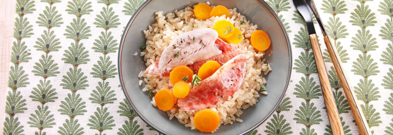 7- Quand il est cuit, égouttez le riz (ajouttez une noix de beurre pasteurisé) puis servez-le avec le poisson.