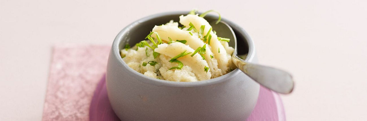 4- Passez au presse-légumes les morceaux d'artichauts et de pomme de terre.