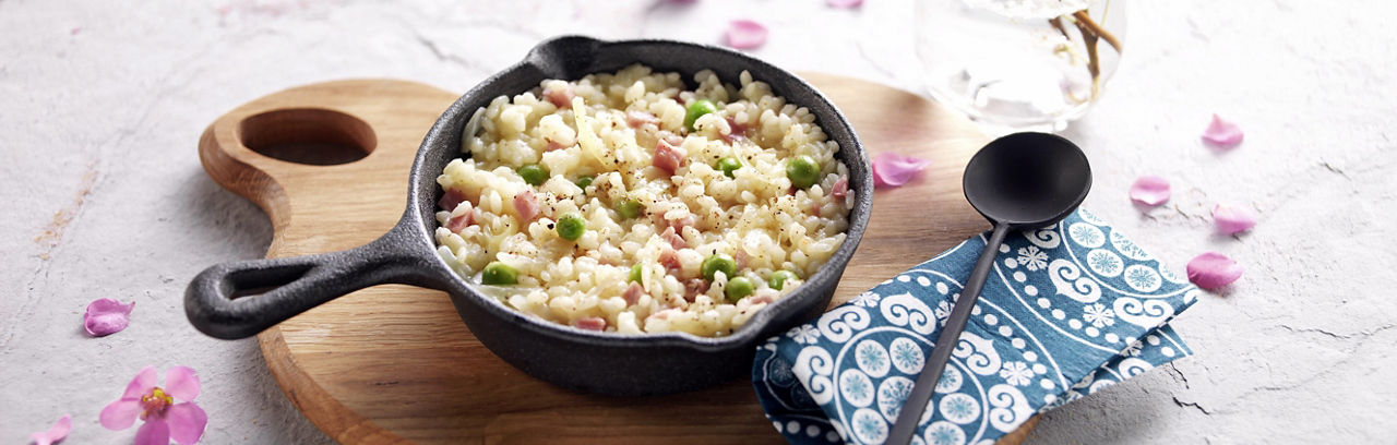 6- Mélangez le riz aux petits pois avec le fromage et le jambon. Poivrez et servez aussitôt.