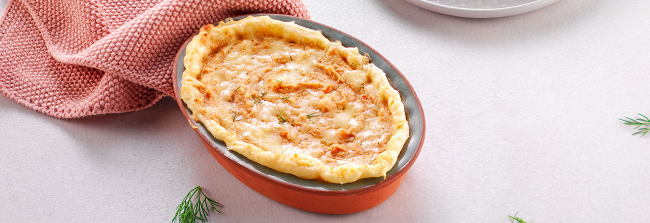 6. Verser la purée légume/poisson sur le fond de tarte précuit et parsemez de gruyère râpé.
