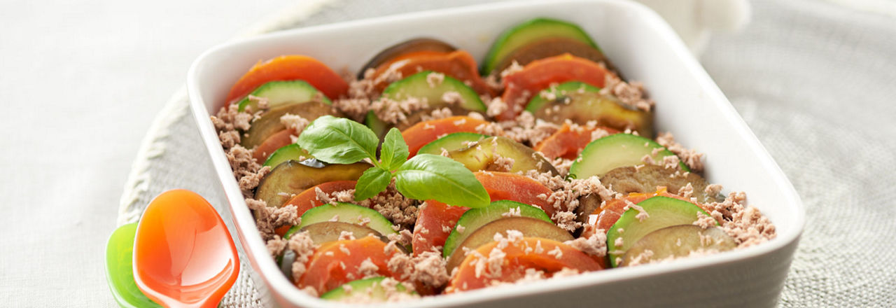 4- Disposez verticalement les tranches de tomates/courgettes/aubergine, etc. Entre les couches, parsemez d’ail et oignon cuits. Salez et poivrez.