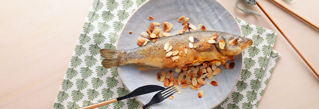 4- Disposez la truite dans une assiette et saupoudrez-la d’amandes grillées.