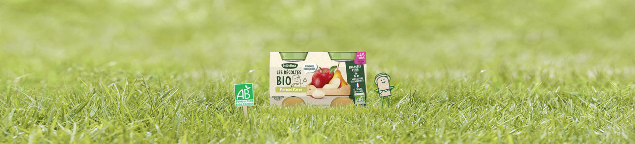 Nos purées de fruits (compotes de fruits sans sucres ajoutés*) bio permettent à votre bébé de découvrir des mélanges de fruits bio simples, comme pomme/poire ou pomme/pruneau, dès 4/6 mois.