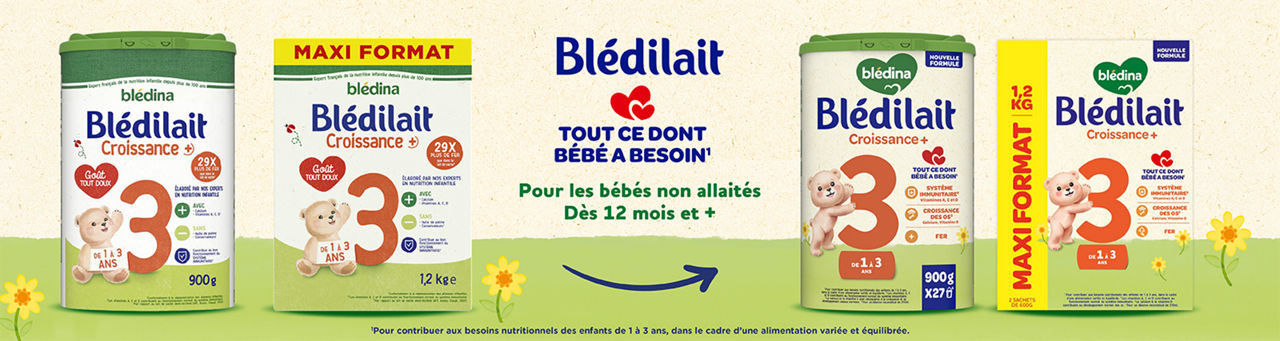La reformulation de Blédilait Croissance + permet de contribuer à couvrir les besoins nutritionnels spécifiques des enfants en bas âge1, pour lesquels nous observons après 12 mois des apports parfois insuffisants (par exemple en fer).