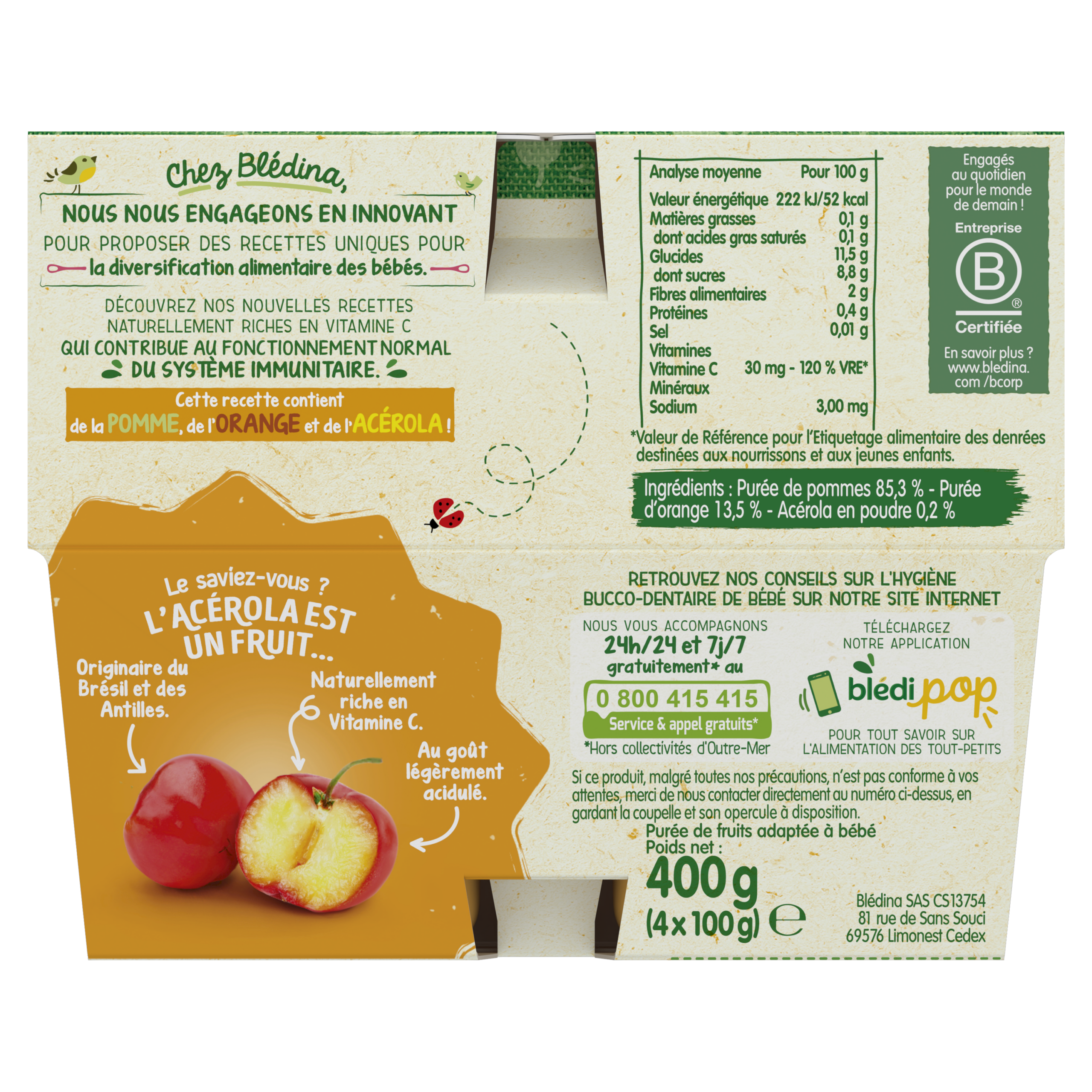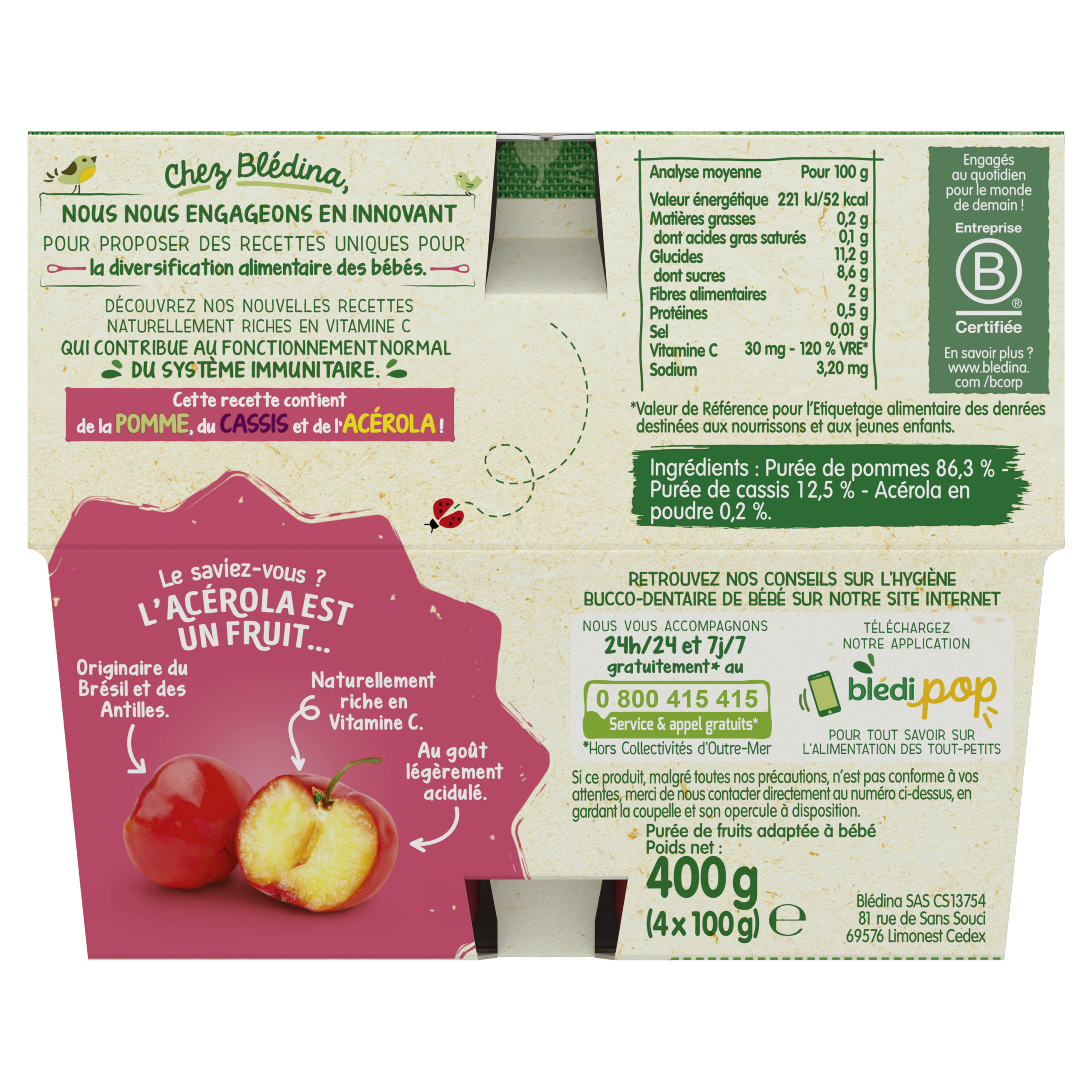 Les nouvelles recettes de la gamme des purées de fruits, naturellement riches en vitamine C qui contribue au fonctionnement normal du système immunitaire*. Faites découvrir à bébé des mélanges de fruits gourmands et inédits, pour éveiller les papilles de bébé. Riche en vitamine C qui soutient le système immunitaire* Sans sucres ajoutés : contient les sucres naturels des fruits Sans résidus de pesticides : taux inférieurs à 0,000001%, conformément aux règles de l'alimentation infantile. Plus de 15 recettes de purées de fruits à découvrir, élaborées par nos nutritionnistes et cuisinées en France à Brive la Gaillarde et parfaitement adaptées à l'âge de bébé (conformément à la réglementation de l'alimentation infantile). ⠀⠀⠀⠀⠀⠀⠀⠀⠀ Ce lot contient 12 coupelles : 1x Coupelles Pomme Oranges Acérola (4x100g) 1x Coupelles Pomme Cassis Acérola (4x100g) 1x Coupelles Pomme Kiwi Acérola (4x100g) *La vitamine C contribue au fonctionnement normal du système immunitaire