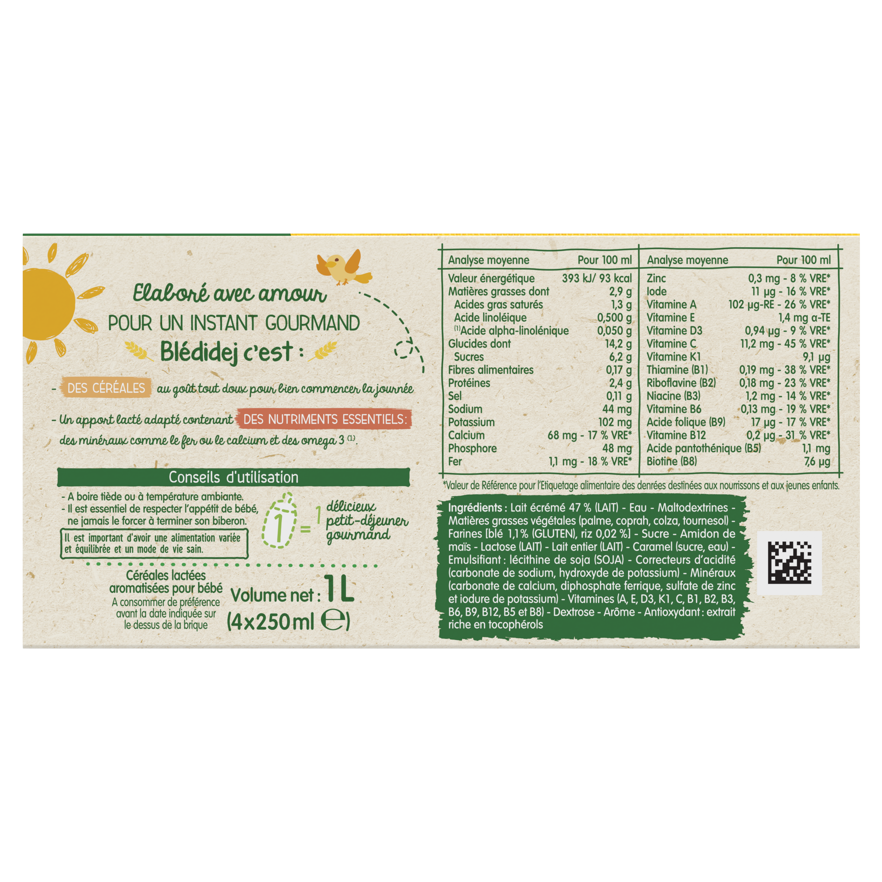 Blédidej, ce sont de délicieuses céréales lactées au goût tout doux et à la texture onctueuse pour bien commencer la journée ! Découvrez Blédidej Saveur Biscuit pour un petit-déjeuner complet et équilibré à la saveur gourmande du biscuit dès 6 mois.   Un format brique pratique à emmener partout 1 brique = 1 biberon  Lot de 3 packs contenant chacun 4 briques de 250mL.