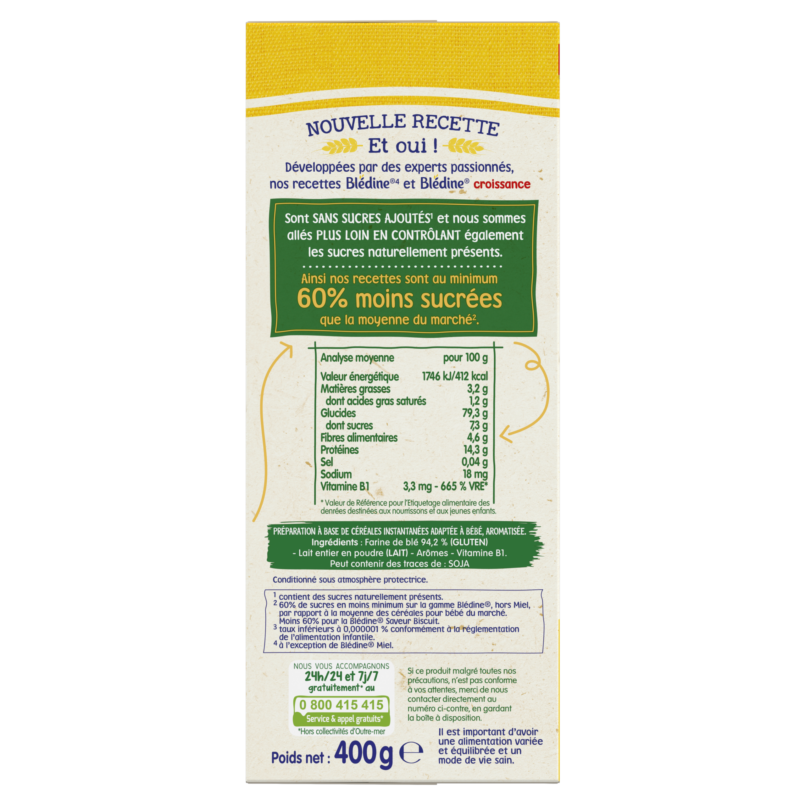 INFORMATION CONSOMMATEUR - RAPPEL PRODUIT La qualité de nos produits étant notre priorité, nous avons décidé de procéder au rappel de 6 lots de BLEDINE Céréales saveur Biscuit dès 6 mois format 400g portant les DDM suivantes : 03/09/2026 - 04/09/2026 - 05/09/2026 - 06/09/2026 - 09/09/2026 - 11/09/2026 Nous vous invitons donc à ne pas consommer les produits concernés par ce rappel, non conforme à une limite réglementaire, et à contacter notre service consommateur en cas de doute au 0800 415 15. Des investigations sont en cours pour identifier l’origine de l’incident et mettre en place les mesures nécessaires pour éviter que cela ne se reproduise. Nous prions nos consommateurs de bien vouloir nous excuser pour la gêne occasionnée. Experts en nutrition infantile et inventeurs des céréales pour bébé, nous avons à cœur de proposer des recettes adaptées* aux besoins et au petit palais de bébé. Nous avons fait le choix de limiter drastiquement la quantité de sucres présente dans nos recettes et ça ne passe pas inaperçu. C'est un goût toujours doux et plus délicat, une couleur plus claire, une odeur gourmande plus subtile et une texture plus généreuse. La Blédine® régale les bébés depuis plus de 100 ans et ce n'est pas prêt de changer. La Blédine® a été inventée par 2 pharmaciens Léon Jacquemaire et Maurine Miguet en 1906. La Blédine® est élaborée en France dans notre usine historique de Villefranche-sur-Saône. Lot de 3 packs contenant chacun 400g de préparation. *Conformément à la réglementaire de l'alimentation infantile