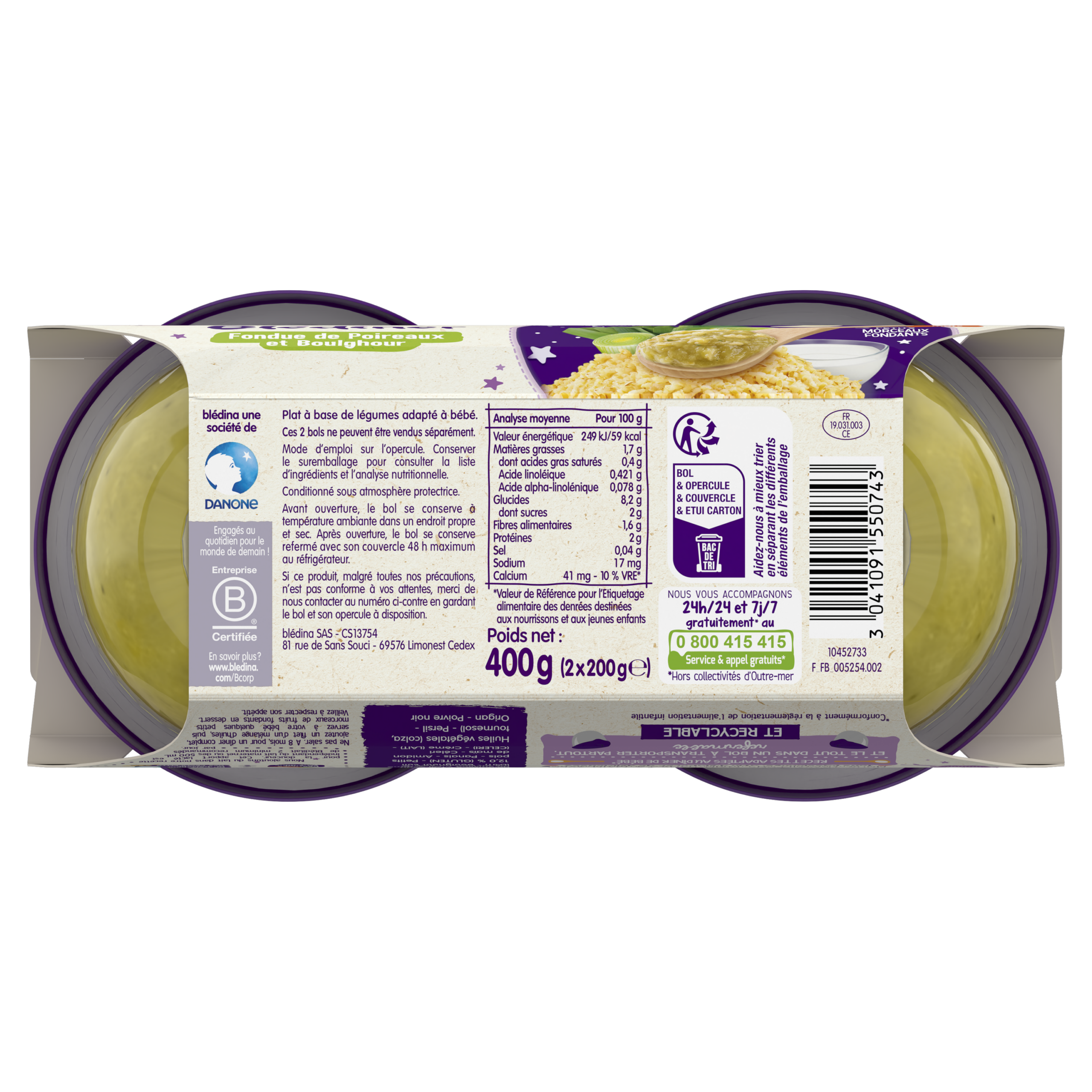 Les bols Blédîner Fondue de Poireaux et Boulghour offrent les apports nécessaires pour le repas du soir de bébé, dès 8 mois, du lait pour la douceur, des légumes pour éveiller ses papilles et des féculents. Désormais nos bols sont sans couvercle ! Et non sans raison, car cela permet à Blédina d’éviter l’utilisation de plus de 130 tonnes de plastique par an*. Cela représente une réduction de 35,6% de plastique sur chacun de nos bols ! Ce lot contient 6 bols de 200g chacun. *Sur la base des projections de vente des Bols Blédina 2x200g en 2024 (marché GMS français).