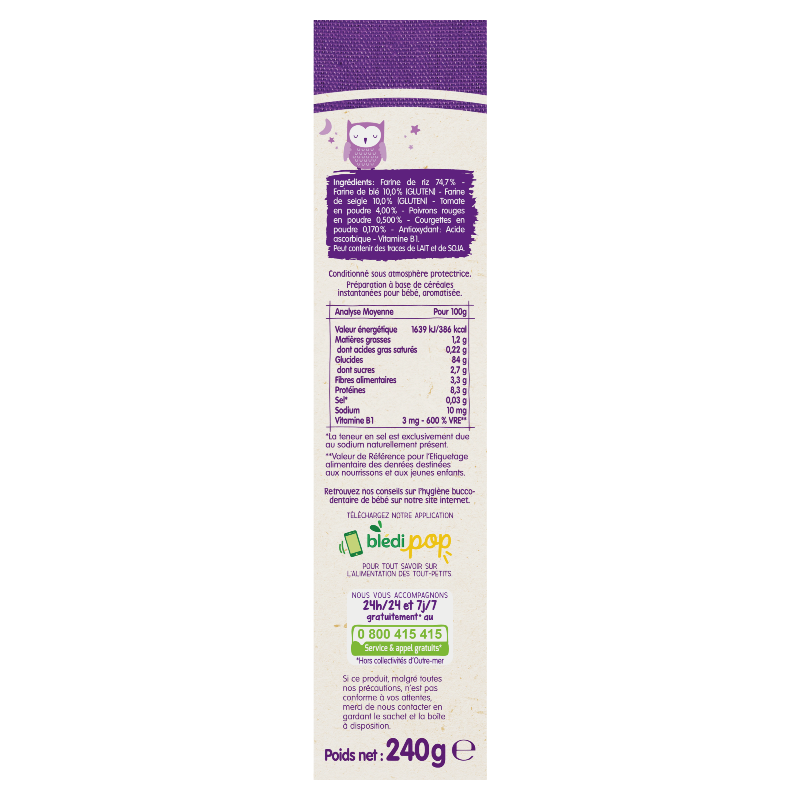 Découvrez Les céréales du soir Blédîner de Blédina : de savoureuses recettes de céréales du soir adaptées pour le dîner de bébé avec une touche de légumes. Initiez bébé à de nouvelles saveurs avec notre lot Blédîner Multicéréales Légumes du soleil dès 8 mois, pour faire découvrir à bébé le bon goût des légumes en toute simplicité ! Contient une mesurette pratique pour doser Une texture onctueuse de céréale bébé qui passe à la tétine A reconstituer avec le lait habituel de bébé (lait maternel ou lait de suite) Format pratique et facile à préparer Lot de 3 packs contenant chacun 240g de céréales.