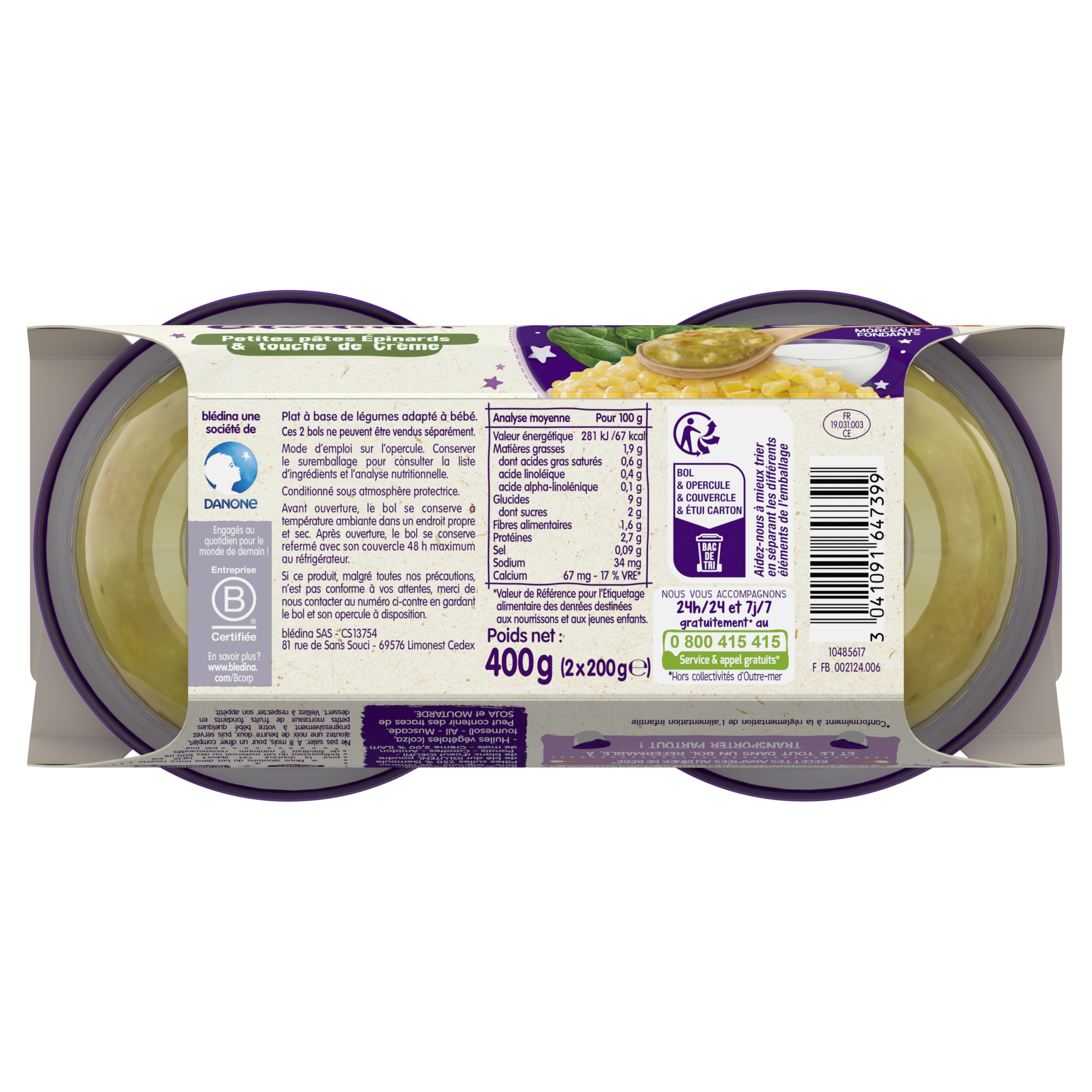 Blédîner - Petites Pâtes Epinards et touche de crème - Lot x 3