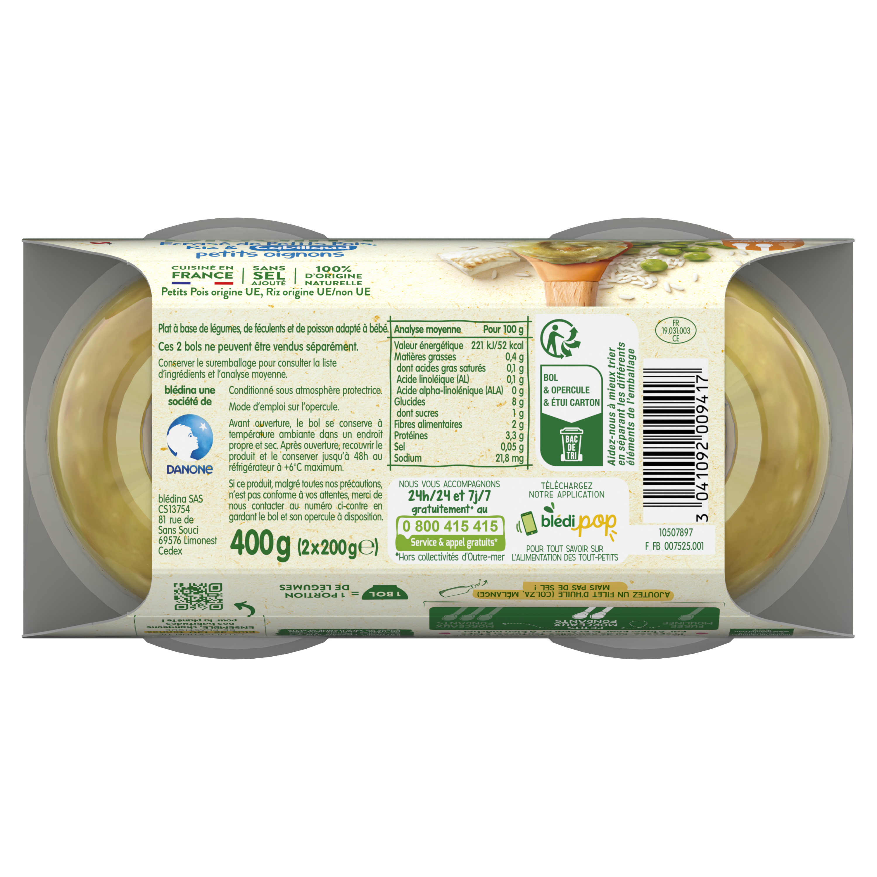 Faites découvrir à bébé notre recette Ecrasé de petits pois Riz Cabillaud et Petits Oignons dès 8 mois. Des petits morceaux fondants pour préparer bébé à bien mâcher. Nous avons retravaillé notre gamme Mes Moulinés : désormais les bols Déjeuner offrent une texture progressive de 6 à 12 mois, et sont sans couvercle ! Et non sans raison, car cela permet à Blédina d’éviter l’utilisation de plus de 130 tonnes de plastique par an*. Cela représente une réduction de 35,6% de plastique sur chacun de nos bols ! Lot de 6 bols de 200g chacun *Sur les bols Blédina (midi et soir), 2 x 200g, sur la base des ventes annuelles de 2023