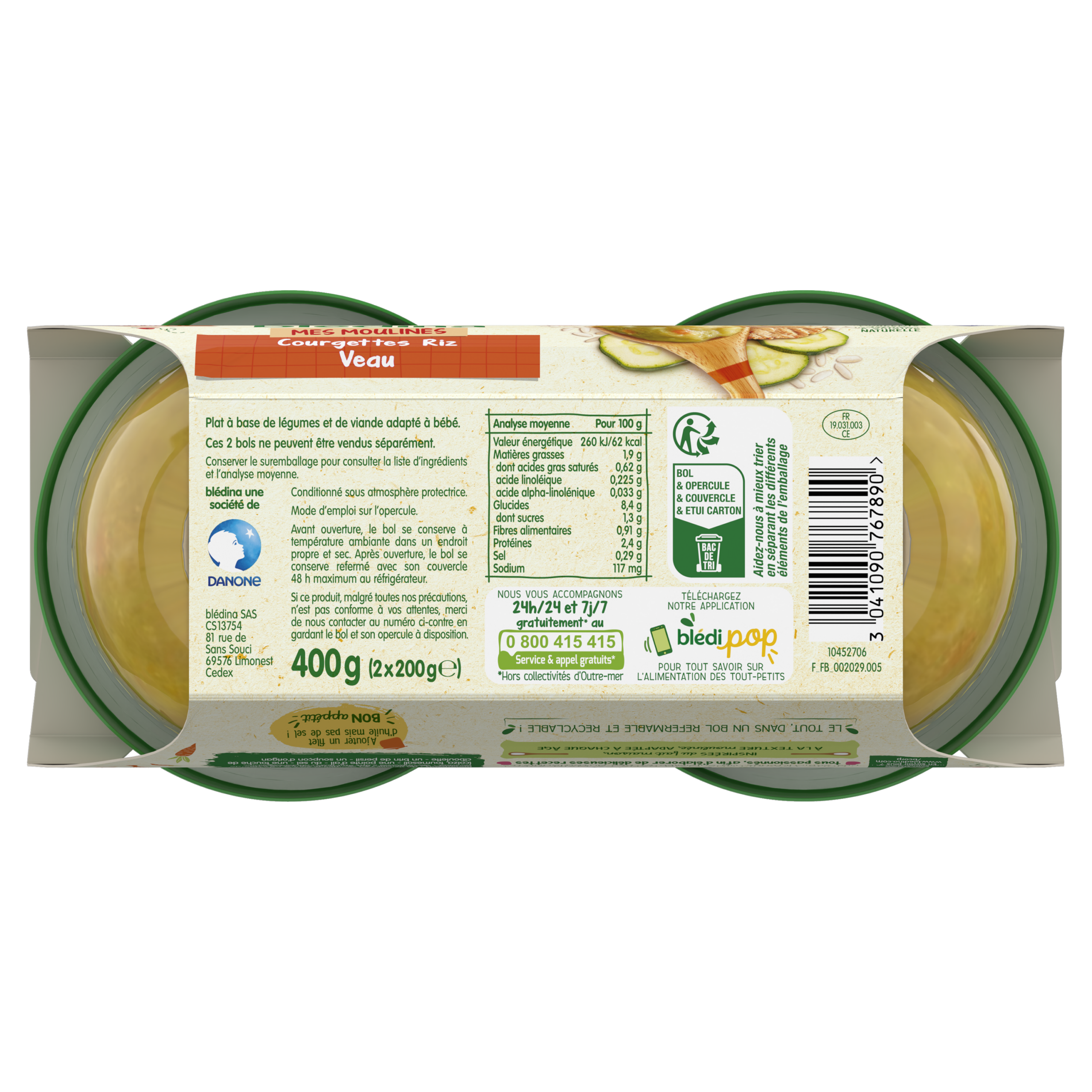 Découvrez nos bols Déjeuner Risotto de Courgettes et Veau, un plat adapté à bébé dès 12 mois, inspiré du fait-maison, cuisiné en France* et avec des morceaux fondants pour continuer l'apprentissage de la mastication. Nous avons retravaillé notre gamme Mes Moulinés : désormais les bols pour le déjeuner offrent une texture progressive de 6 à 12 mois, et sont sans couvercle ! Et non sans raison, car cela permet à Blédina d’éviter l’utilisation de plus de 130 tonnes de plastique par an**. Cela représente une réduction de 35,6% de plastique sur chacun de nos bols ! Lot de 6 bols de 200g chacun * Courgettes origine UE / Rie origine UE/ non UE et Veau issue du Label Rouge Origine France **Sur la base des projections de vente des Bols Blédina 2x200g en 2024 (marché GMS français).