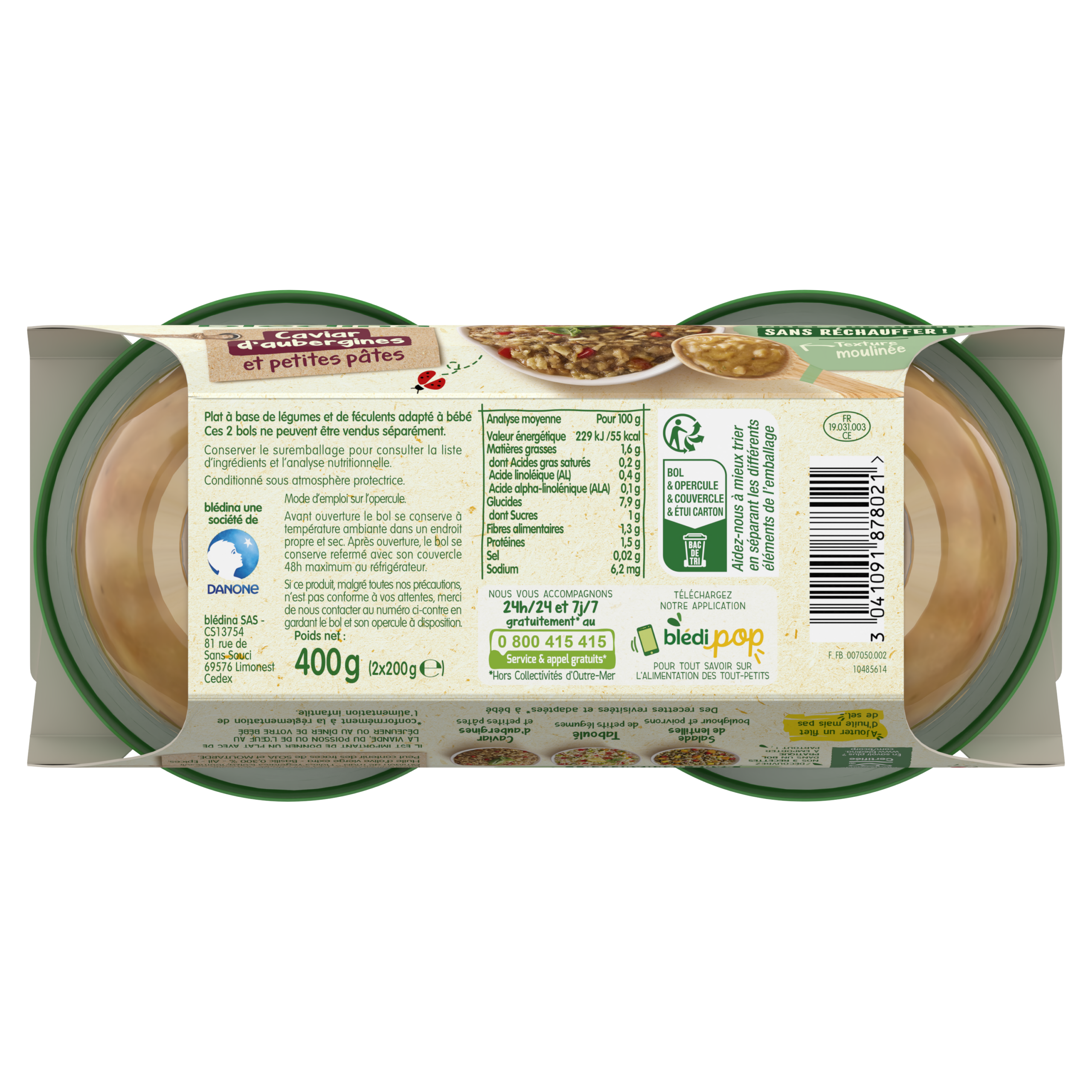 Découvrez notre notre Caviar d'Aubergines et petites pâtes revisité et adapté à bébé*, une recette directement prêt à déguster sans besoin de la réchauffer ! Avec des petits morceaux fondants pour préparer bébé à bien mâcher ! Nous avons retravaillé notre gamme Mes Moulinés : désormais les bols Déjeuner offrent une texture progressive de 6 à 12 mois, et sont sans couvercle ! Et non sans raison, car cela permet à Blédina d’éviter l’utilisation de plus de 130 tonnes de plastique par an*. Cela représente une réduction de 35,6% de plastique sur chacun de nos bols ! Ce lot contient 6 bols de 200g chacun *conformément à la réglementation de l'alimentation infantile **Sur les Bols Blédina (midi et soir) 2x200g sur la base des ventes annuelles 2023.