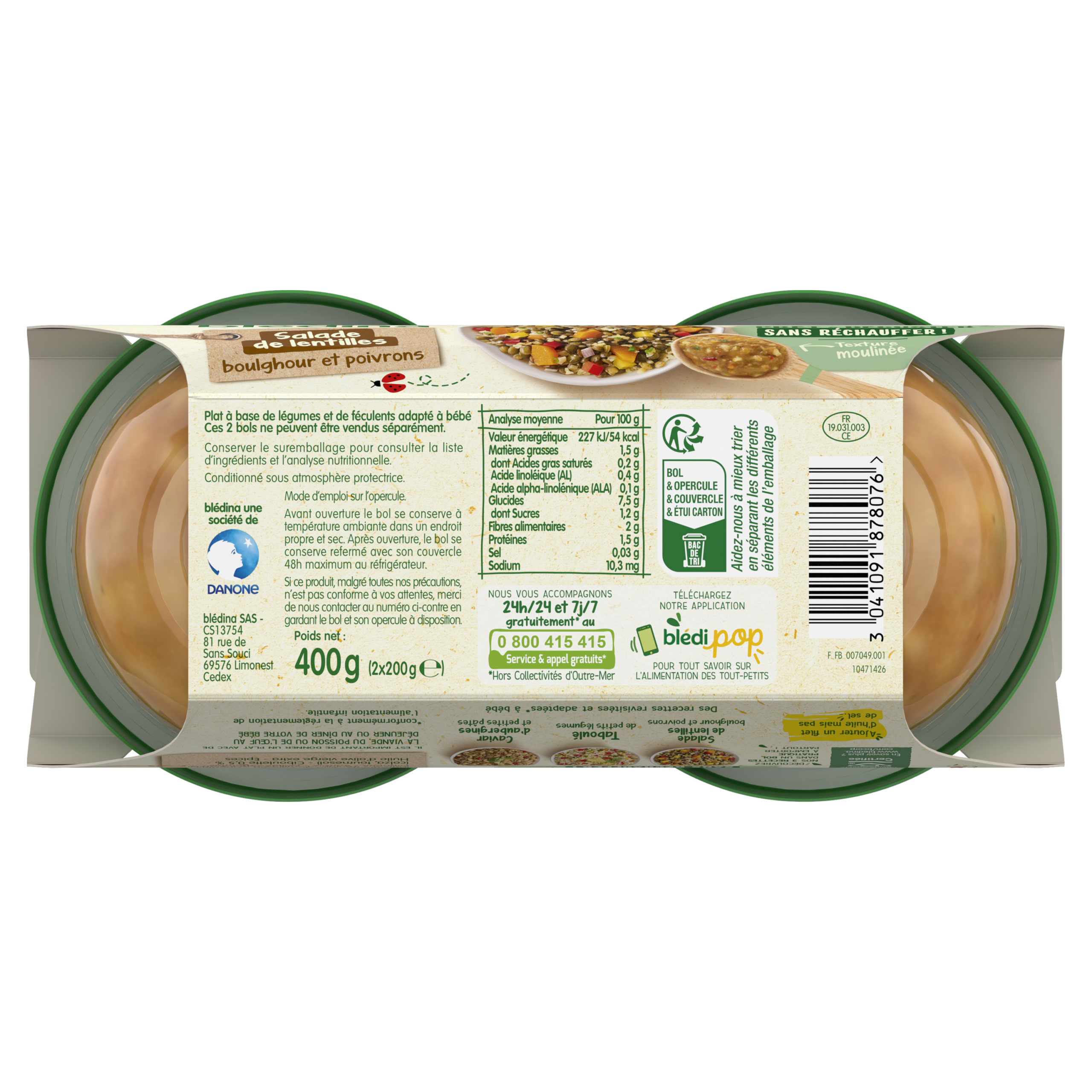 Découvrez notre notre Salade de Lentilles Boulghour et Poivrons revisitées et adaptées à bébé*, une recette directement prête à déguster sans besoin de la réchauffer ! Avec des petits morceaux fondants pour préparer bébé à bien mâcher ! Désormais les bols Blédina sont sans couvercle ! Et non sans raison, car cela permet à Blédina d’éviter l’utilisation de plus de 130 tonnes de plastique par an**. Cela représente une réduction de 35,6% de plastique sur chacun de nos bols ! Ce lot contient 6 bols de 200g chacun *conformément à la réglementation de l'alimentation infantile **Sur les Bols Blédina (midi et soir) 2x200g sur la base des ventes annuelles 2023.