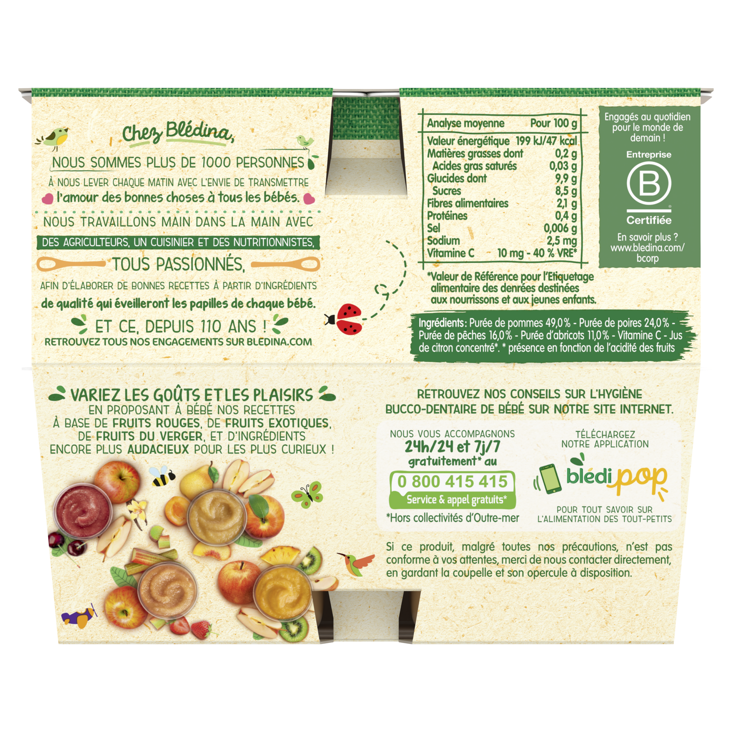 Découvrez Les coupelles de fruits Blédina : de savoureuses recettes de purées de fruits pour le goûter, déjeuner ou dîner de bébé dès 6 mois. Faites découvrir à bébé une incroyable variété de fruits avec l’ensemble de nos saveurs de la gamme Coupelles de fruits ! Sans sucres ajoutés : contient les sucres naturels des fruits. Sans résidus de pesticides : taux inférieurs à 0,000001%, conformément aux règles de l'alimentation infantile. Plus de détails sur bledina.com. Plus de 15 recettes de purées de fruits à découvrir, élaborées par nos nutritionnistes et cuisinées en France à Brive la Gaillarde et parfaitement adaptées à l'âge de bébé (conformément à la réglementation de l'alimentation infantile). Lot de 3 packs contenant chacun 8 coupelles de 100g.