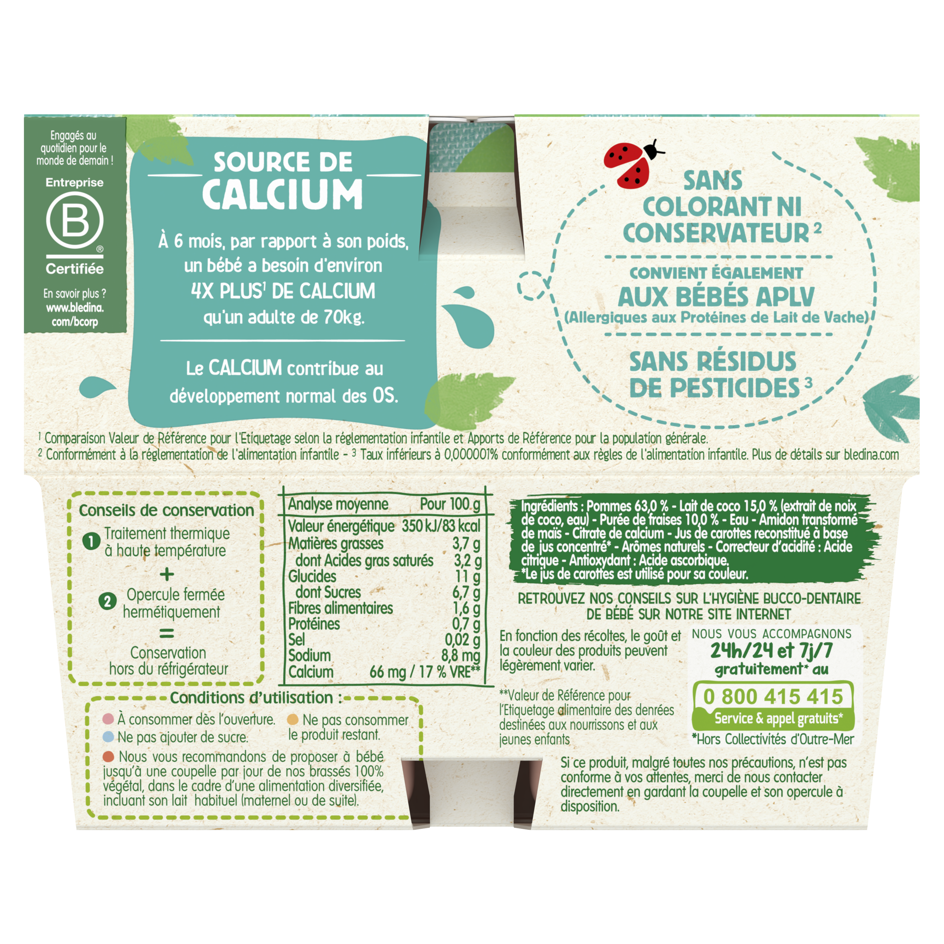 Découvrez les Brassés 100% Végétal : des brassés végétaux Blédina spécialement adaptés à bébé dès 6 mois, au lait de coco, à la pomme et à la fraise, sans sucres ajoutés* et source de calcium ! Le saviez-vous ? A 6 mois, par rapport à son poids, un bébé a besoin d'environ 4 fois plus** de calcium qu'un adulte de 70kg. Le calcium contribue au développement normal des os. Le petit + ? Convient également aux bébés allergiques aux protéines de lait de vache. *Contient des sucres naturellement présents. **Comparaison Valeur de Référence pour l'Etiquetage selon la réglementation infantile et Apports de Référence pour la population générale. Lot de 4 packs contenant chacun 4 pots de 95g.