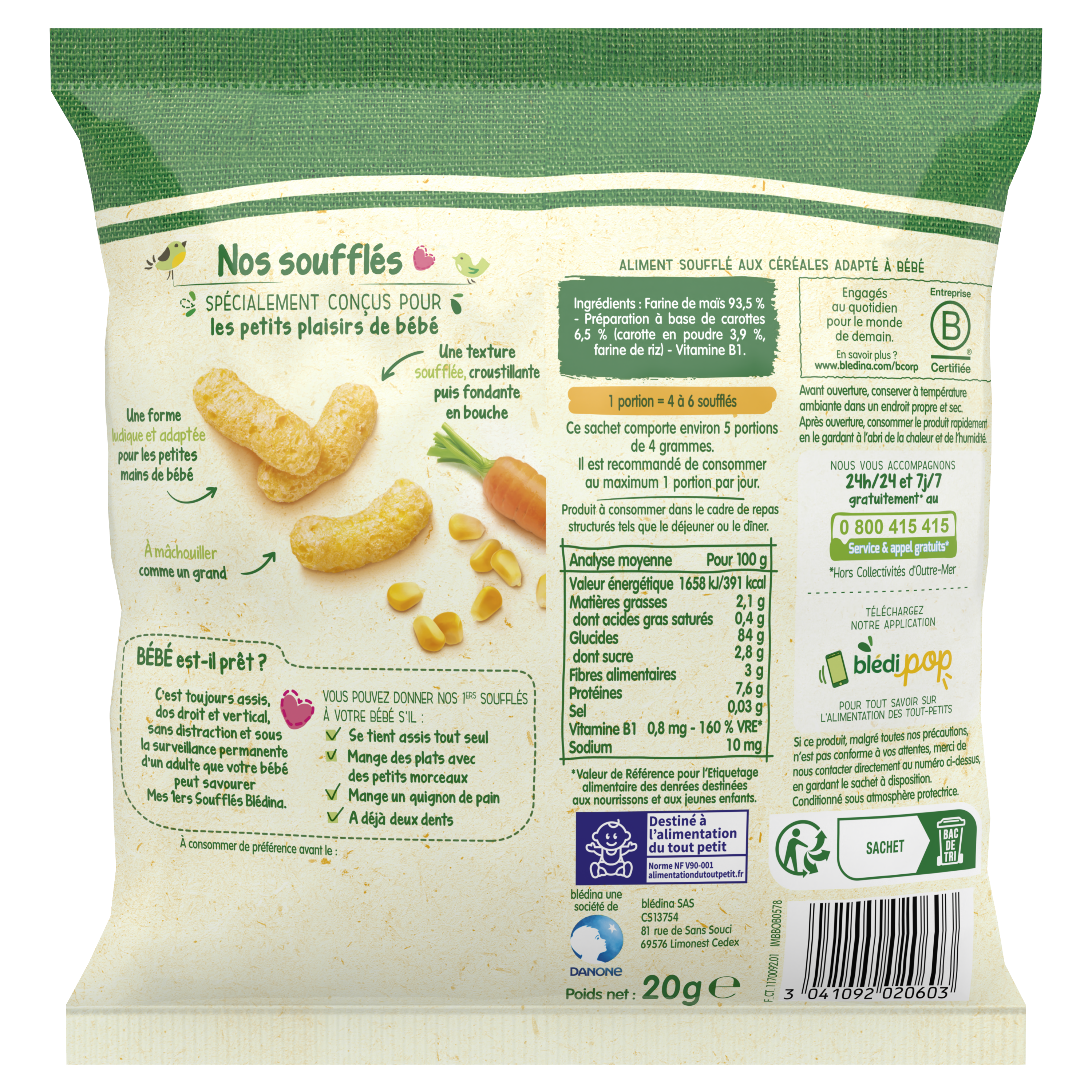 Les 1ers soufflés de Blédina, c’est la gamme dès 10 mois (se référer ci-dessous pour savoir si bébé est prêt), spécialement développée pour faire patienter bébé juste avant le repas, pendant que vous terminez la préparation de son petit plat !   De délicieuses recettes associant des féculents et des légumes, à manger avec les doigts, avec une texture soufflée croustillante puis fondante en bouche, pour de nouvelles expériences sensorielles. Toutes les recettes sont sans sel ajouté, conformément à la réglementation de l’alimentation infantile, et sans huile de palme.    C'est toujours assis, le dos à la verticale, sans distraction et sous la surveillance permanente d'un adulte que votre bébé peut savourer les 1ers soufflés Maïs Carotte. Dès 10 mois, bébé est-il prêt ? Vous pouvez donner les soufflés à votre bébé s'il : Se tient assis tout seul Mange des plats avec des petits morceaux Mange un quignon de pain A déjà 2 dents   Il est recommandé de consommer au maximum 1 portion par jour (4 à 6 Soufflés)   Ce lot contient 4 sachets de 20g chacun.