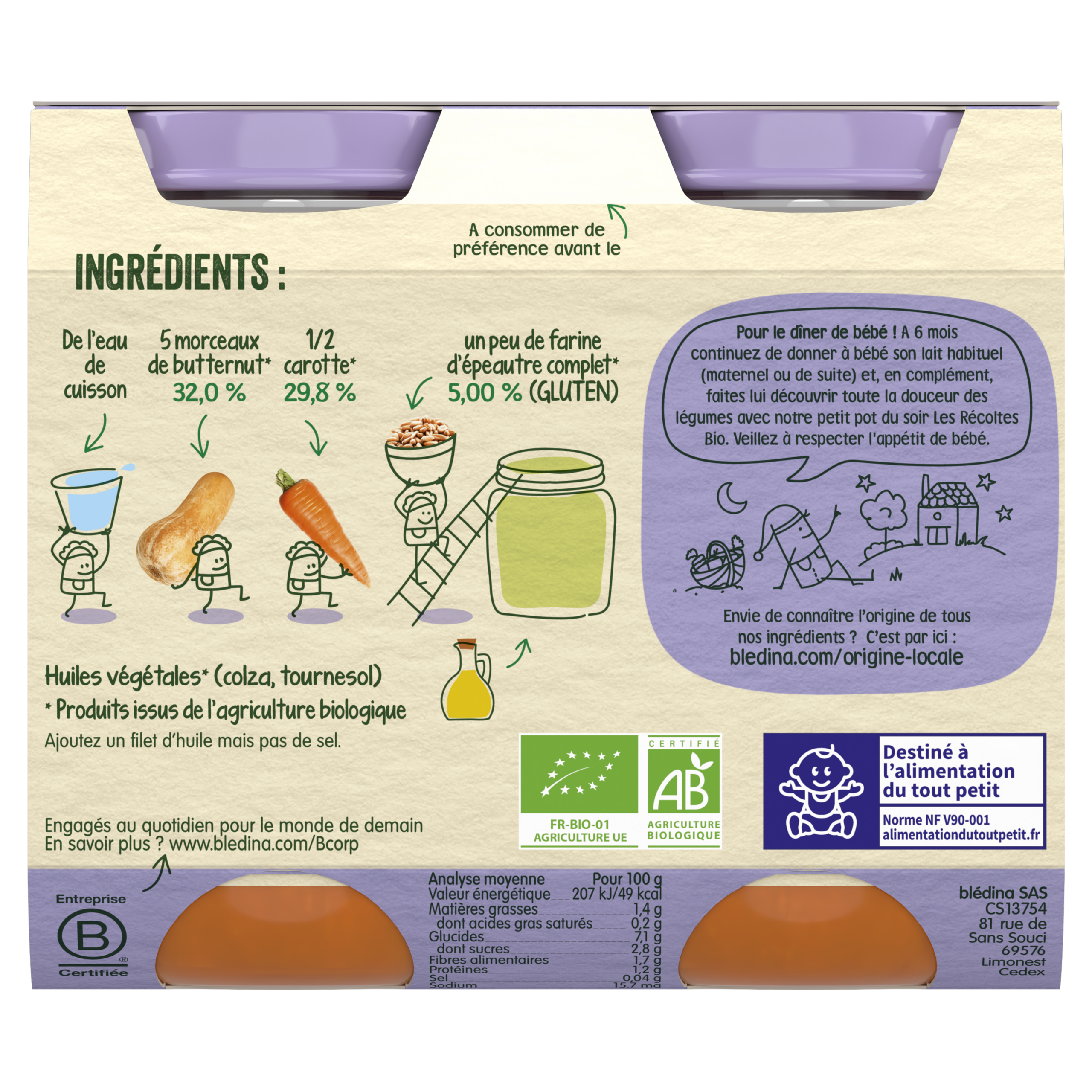 Petits pots Les Récoltes Bio - Butternut Carottes Epeautre - Lot x 4