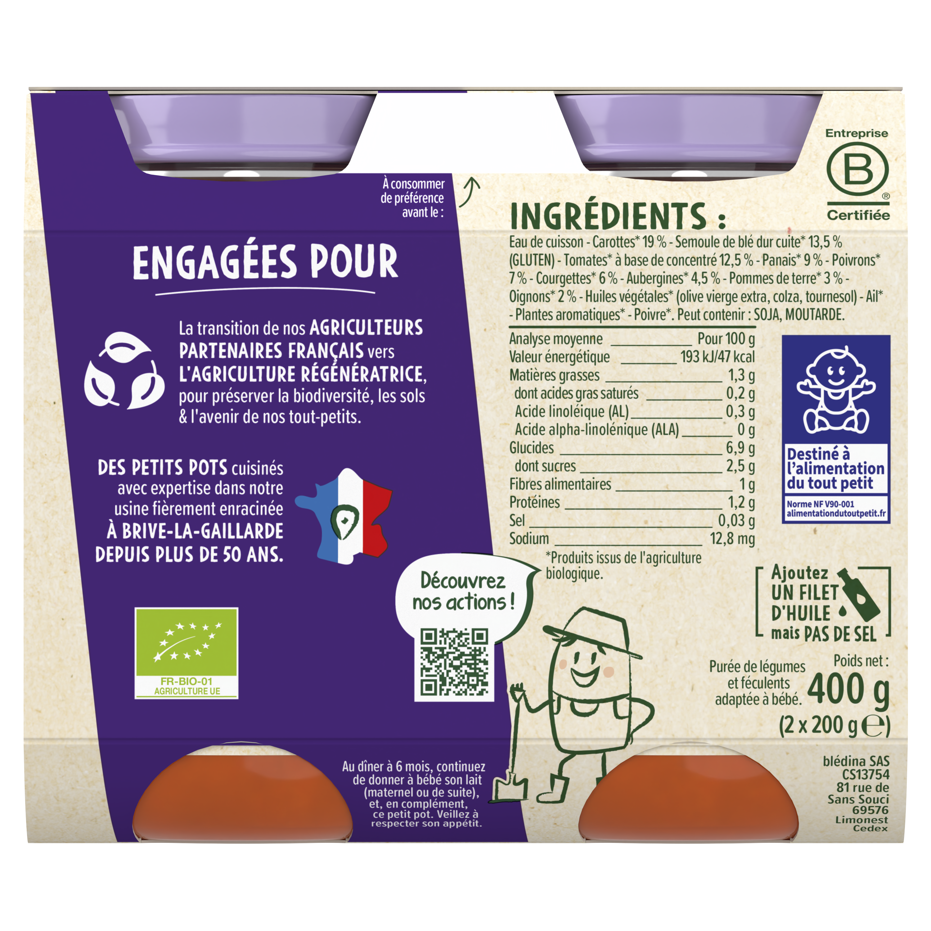 Découvrez les Pots Les Récoltes Bio - Ratatouille Provençale Semoule pour faire découvrir à bébé ses premiers légumes. Lot de 4 packs contenant chacun 2x200g de purée.