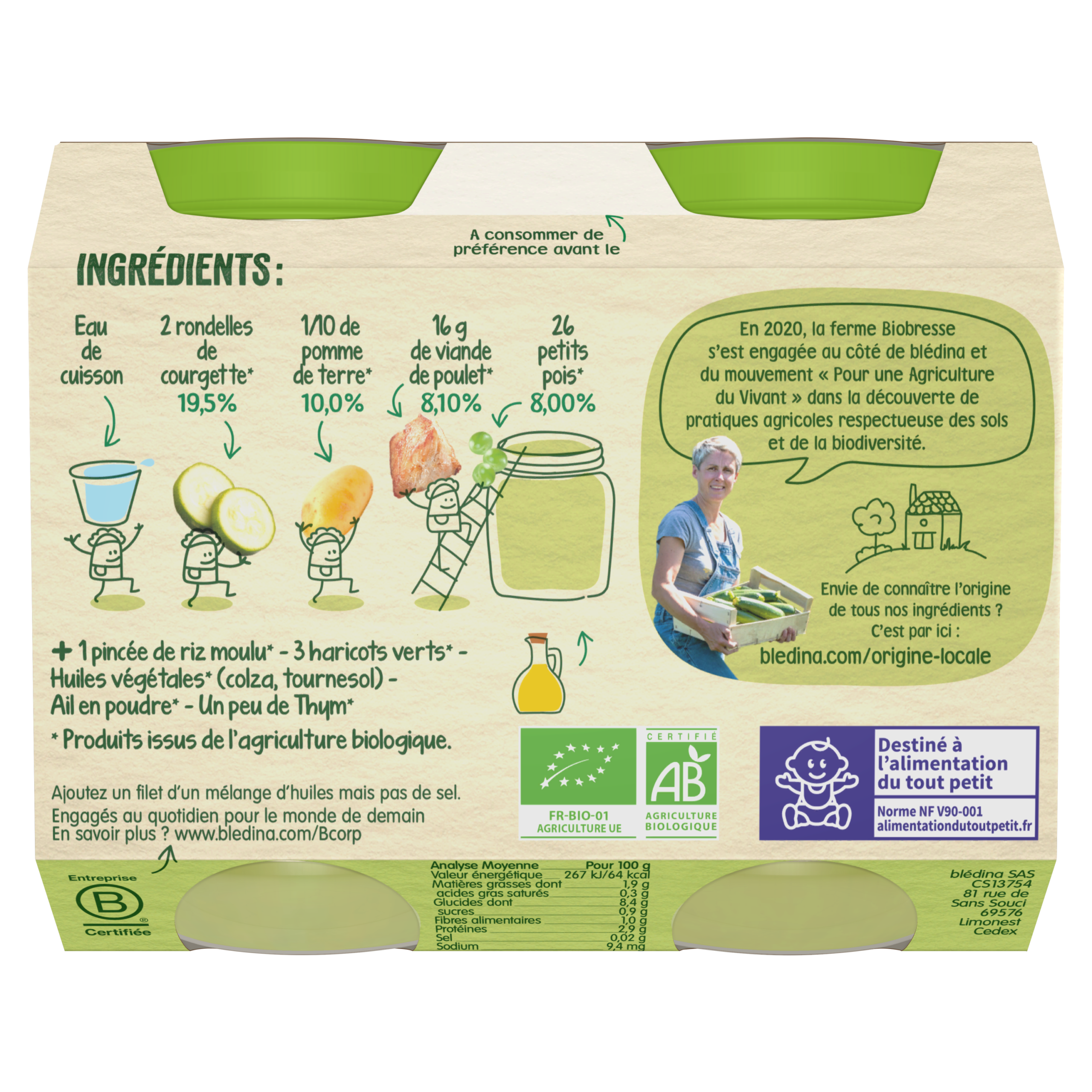 Blédina Les récoltes Bio, de délicieux petits pots bio pour faire découvrir à bébé ses premiers légumes tout en douceur.
