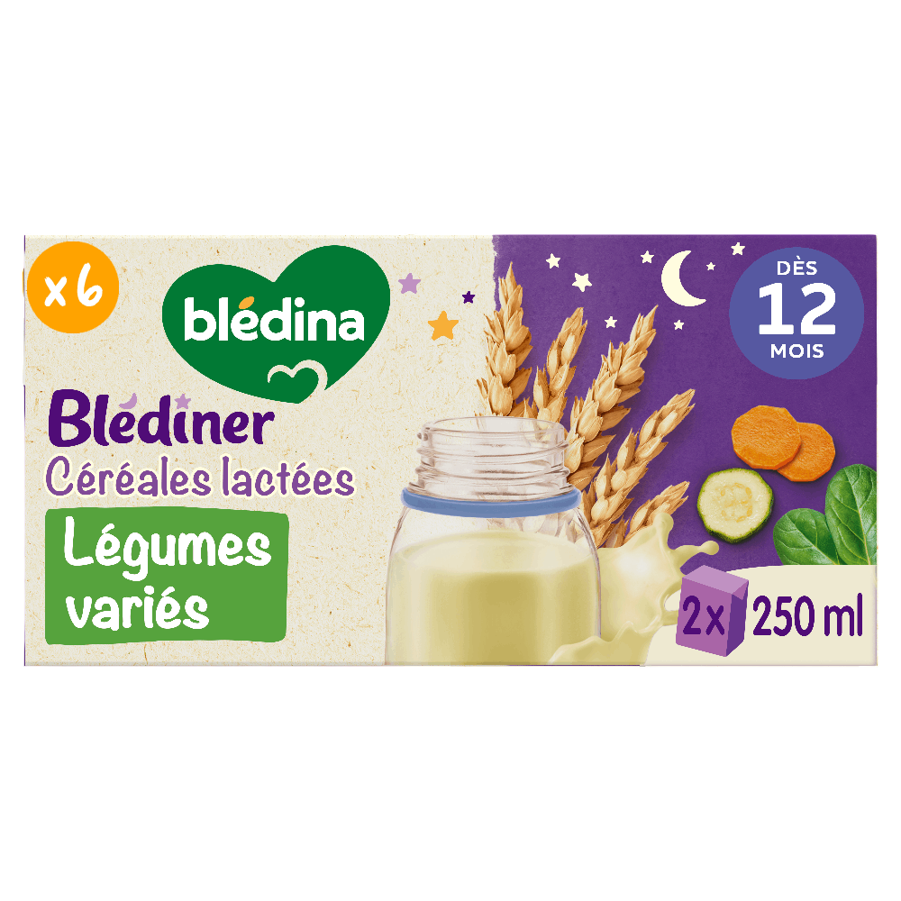 Nouvelle recette : Blédîner Briques Céréales lactées Légumes variés, c’est un savoureux plat complet du soir pour bébé avec un apport lacté adapté, des céréales et des légumes au goût tout doux ! Et le tout dans un format pratique & prêt à l’usage !Le calcium est nécessaire à une croissance et à un développement osseux normaux des enfants. La recette évolue légèrement, retrouvez toutes les informations à jours (ingrédients et valeurs nutritionnelles) ci-dessous. Ce lot contient 12 briques de 250ml chacune