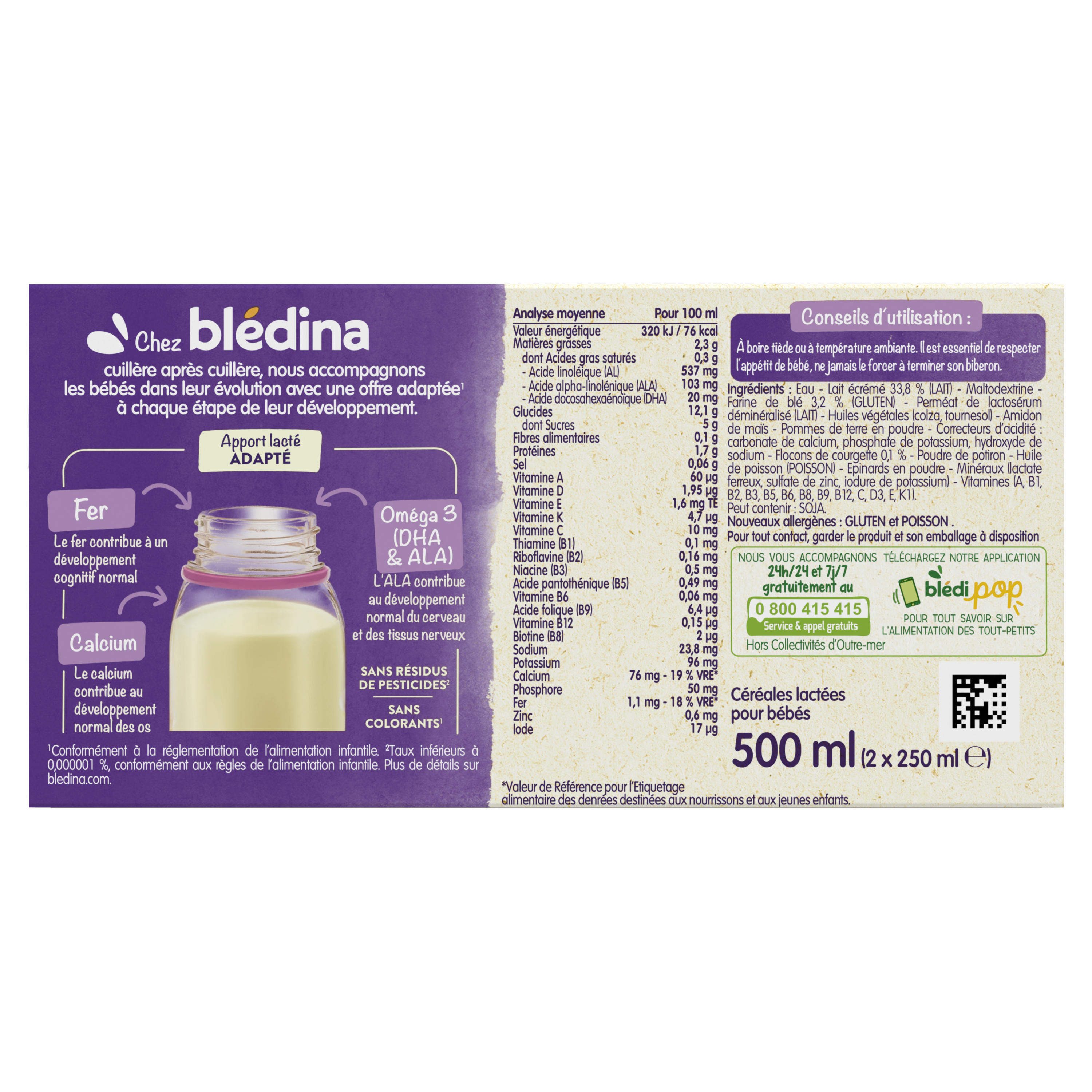 Blédîner Courgettes, c’est un savoureux dîner complet pour bébé avec un apport lacté adapté, des céréales et des légumes au goût tout doux ! Et le tout dans un format pratique & prêt à l’usage ! Pour faire de chaque soir une belle histoire, initiez bébé aux notes douces des légumes en lui proposant des céréales lactées aux légumes Blédiner.