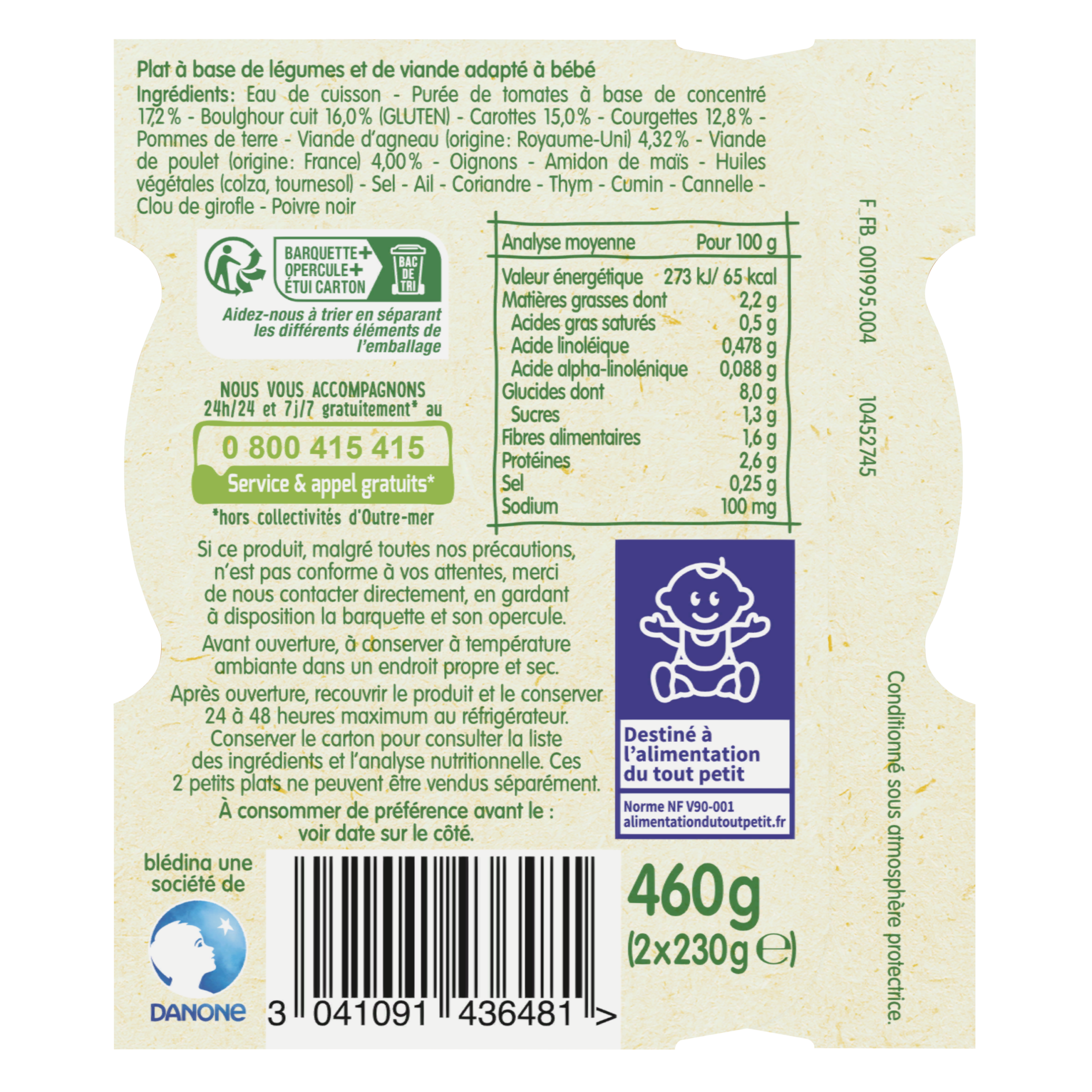 Découvrez les petits plats Blédichef® de Blédina : une large gamme de plats savoureux pour le déjeuner et le dîner, spécialement élaborés pour régaler votre bébé en toute sérénité et lui faire découvrir chaque jour de nouvelles saveurs ! Ce petit plat Blédichef®, avec des petits morceaux, est adapté à bébé à partir de 12 mois. Des ingrédients d’origine naturelle Agneau élevé en plein air Des textures adaptées à l’âge de bébé Un format toujours aussi pratique ⠀⠀⠀⠀⠀⠀⠀⠀⠀ Découvrez nos Blédichef x2 –40% de plastique*. Sans couvercle mais pas sans raison *par rapport à nos anciens plats ⠀⠀⠀⠀⠀⠀⠀⠀⠀ Lot de 8 plats de 230g.