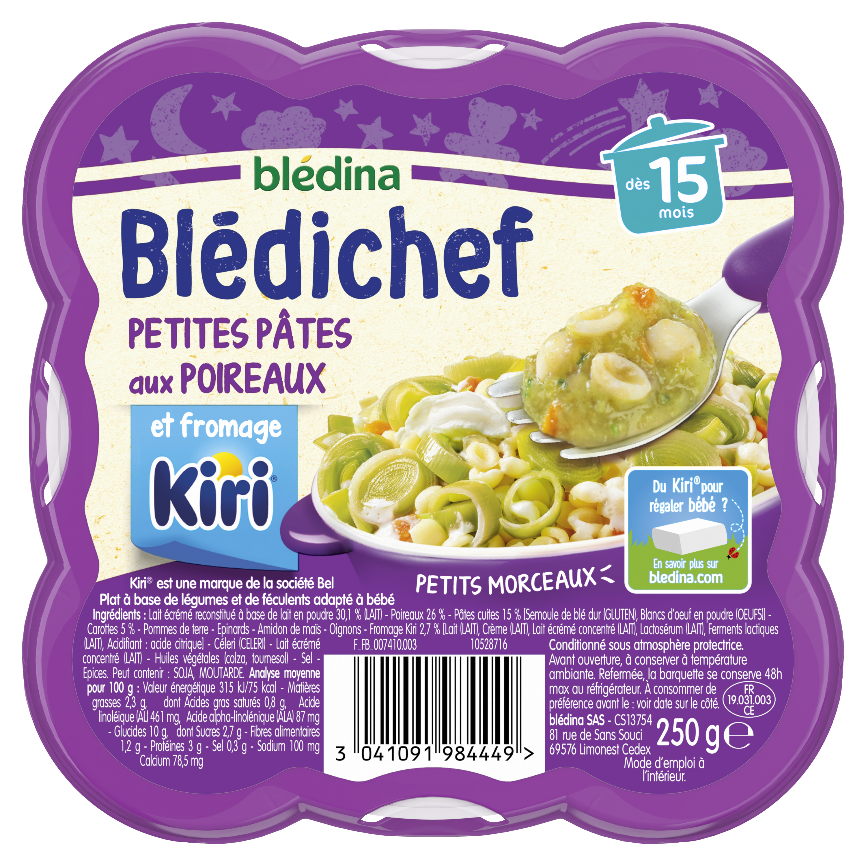 Découvrez ces petits plats Blédichef - Petites Pâtes aux Poireaux et fromage Kiri® dès 15 mois : de délicieuses pâtes fondantes accompagnées de poireaux, avec la douceur du fromage Kiri® qui plaira aux papilles de bébé ! Du fromage Kiri® pour régaler bébé ? Comme d'autres fromages, il est possible de proposer du fromage Kiri® Original* en quantité adaptée lors de la diversification alimentaire de bébé. Blédina a élaboré une gamme de plats du soir au fromage Kiri®, source de calcium, avec une faible teneur en sel et des petits morceaux adaptés.
