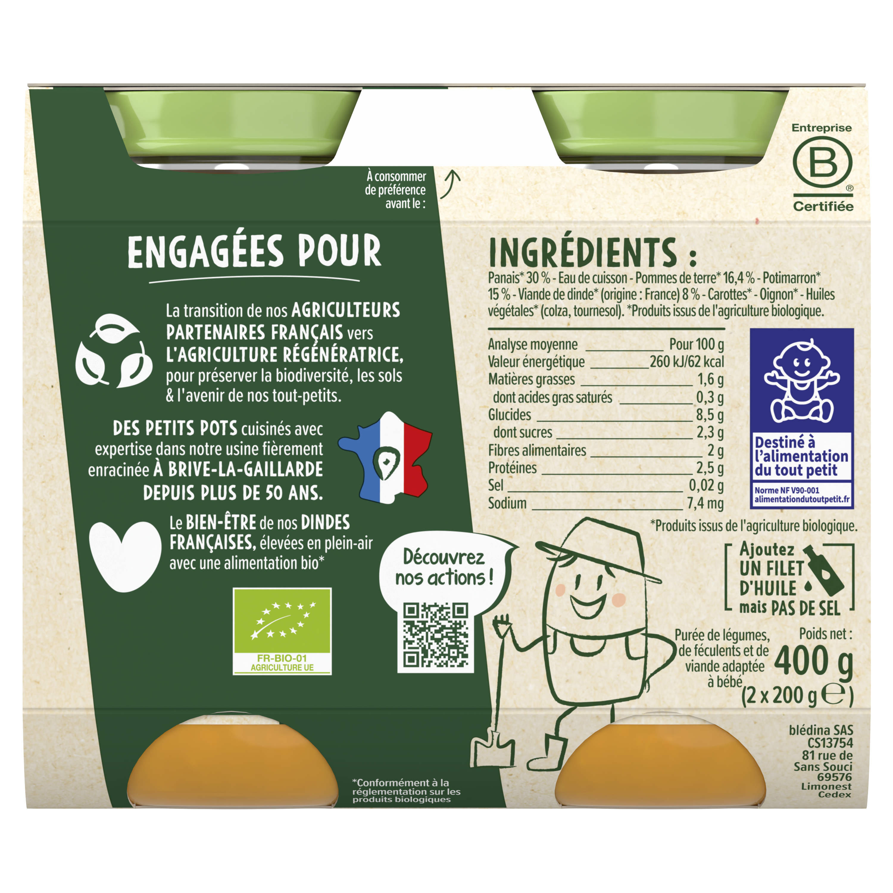 Découvrez nos Petits pots Les récoltes Bio et Engagées, de délicieuses recettes aux légumes accompagnées de viande ou de poisson avec des petits morceaux adaptées aux bébés dès 8 mois. Les Récoltes Engagées : composées d'ingrédients des recettes mitonnées avec du poisson sauvage péché en pleine mer* et issu de la pêche durable, selon le référentiel MSC. C'est pourquoi il ne peut être certifié bio. Comme nos Récoltes Bio, les légumes de ces recettes engagées sont issus de l'Agriculture biologique. * Ce produit est conforme au référentiel mondial du MSC pour la pêche durable. Ce lot contient 6 pots de 200g chacun: 2x Les récoltes Bio - Petits pots Panais Potimarron Dinde petits morceaux 2x Les récoltes Bio - Petits pots - Ecrasé de Carottes Haricots verts Bœuf 2x Les récoltes Bio - Petits pots - Tomates Boulghour et Saumon sauvage
