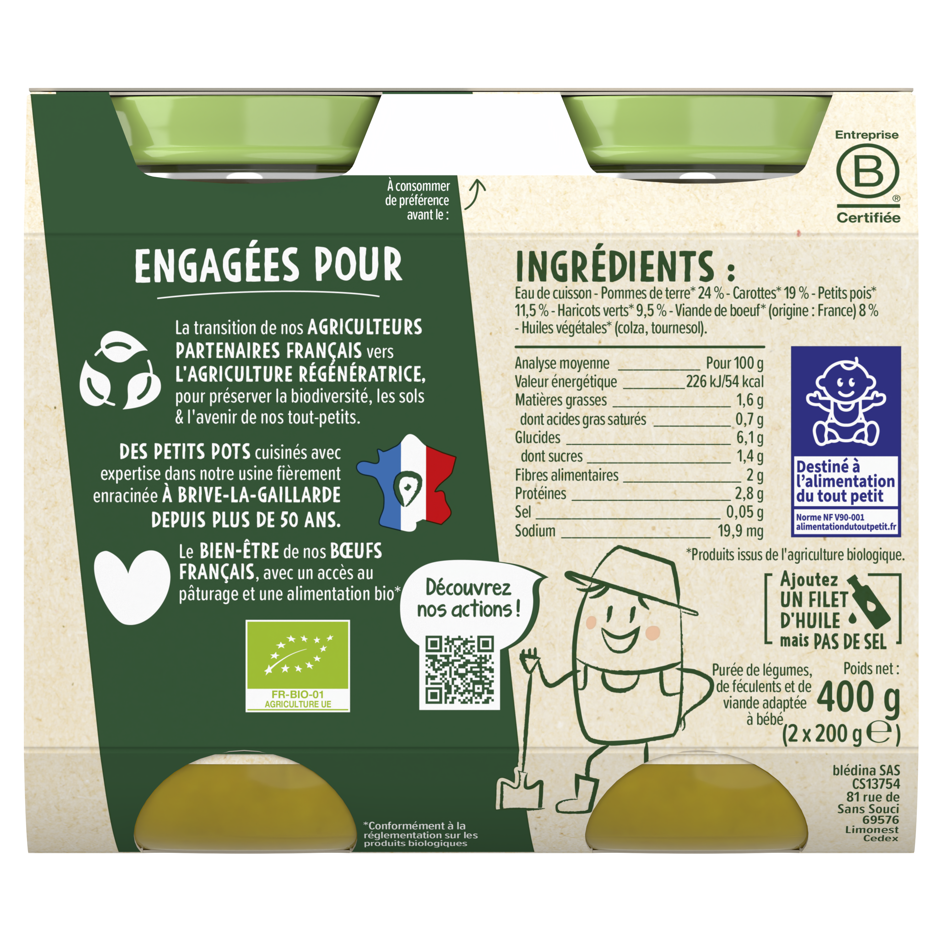 Ce lot contient 6 pots de 200g chacun:  2x Les récoltes Bio - Légumes du Jardin & Bœuf  2x Les récoltes Bio - Carottes, Petits Pois et Poulet 2 x Les récoltes Bio - Brocolis, Pommes de Terre & Veau
