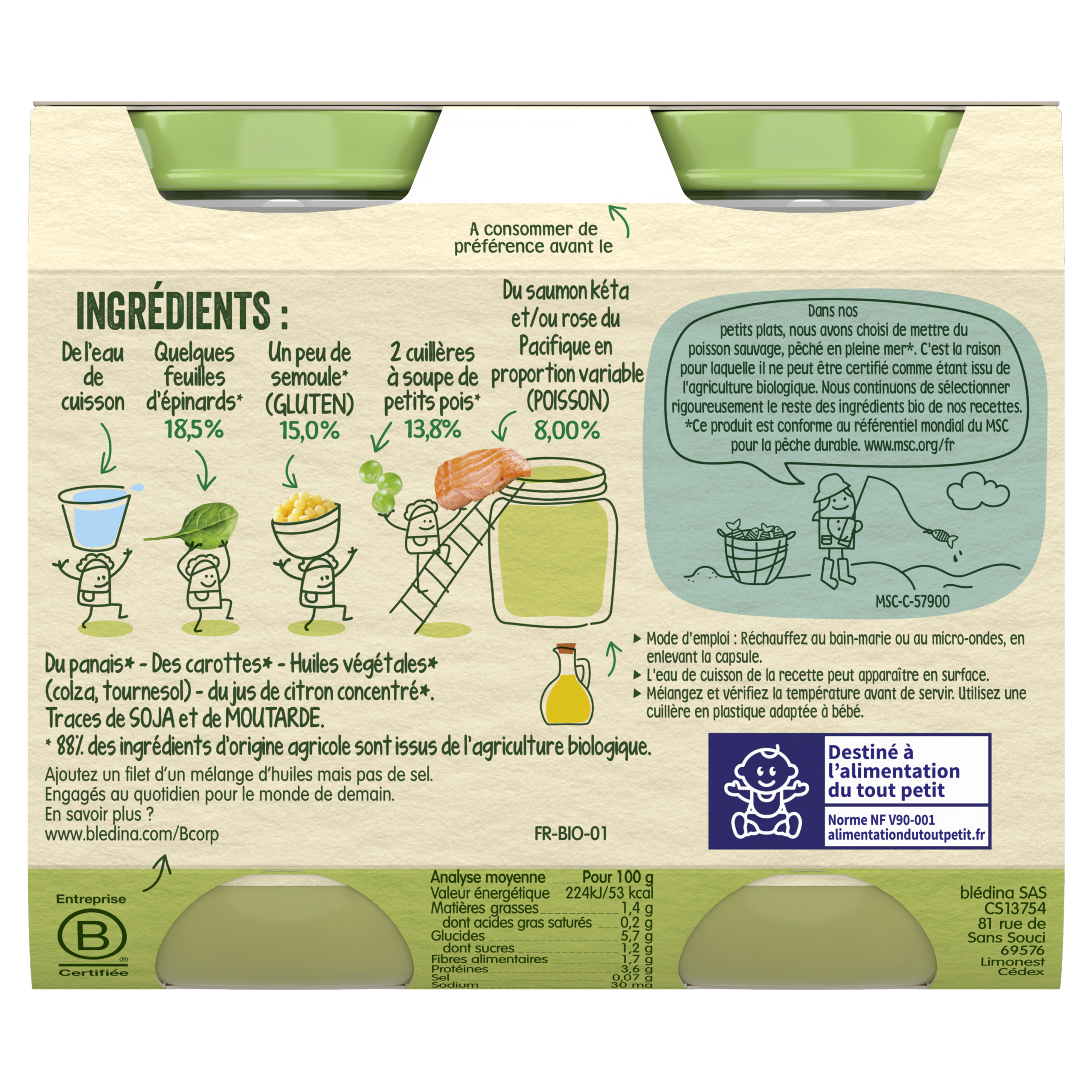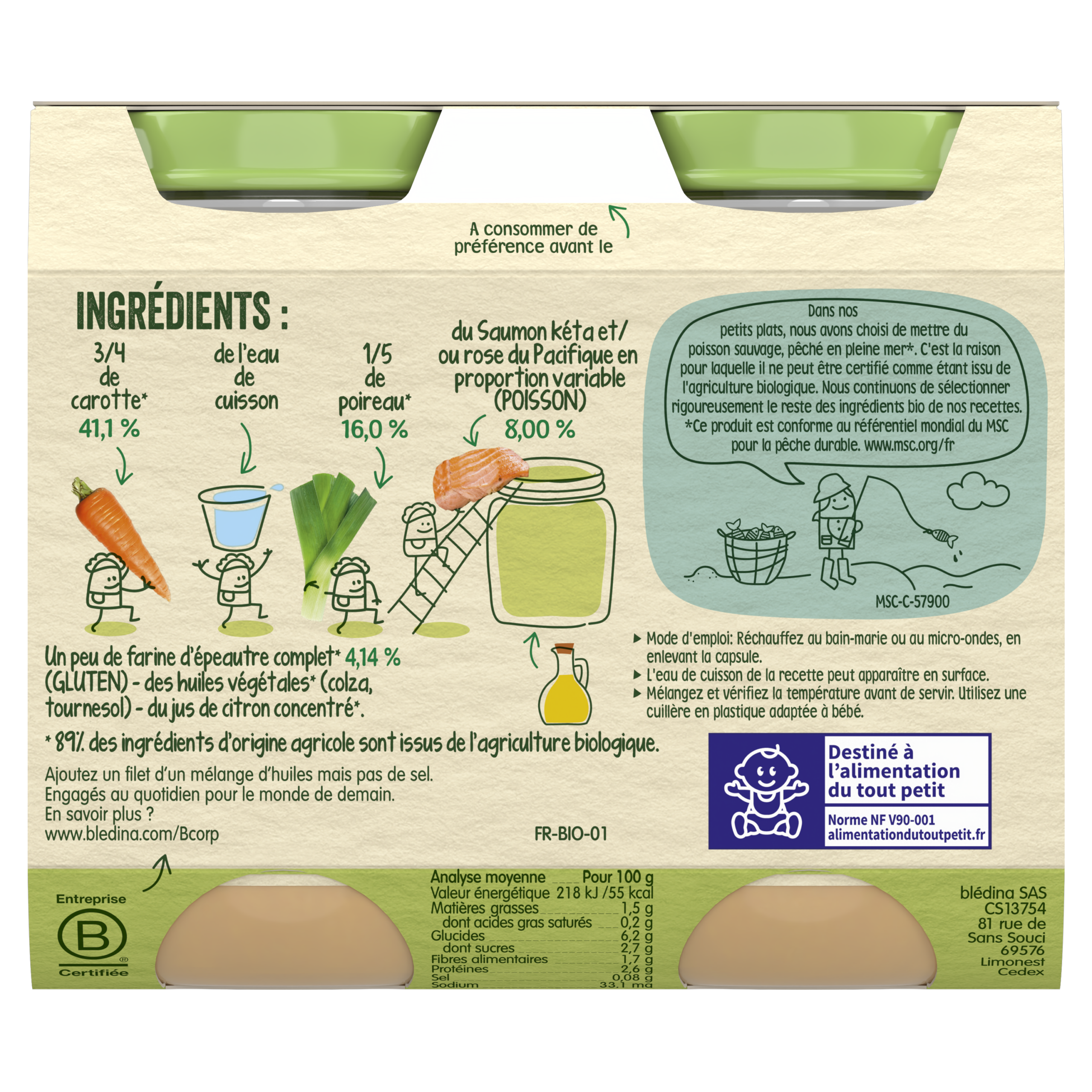 Découvrez nos Petits pots Les récoltes Engagées, pour faire découvrir à bébé le bon goût du Saumon sauvage accompagné de délicieux légumes. A déguster dès 6 mois. Les Récoltes Engagées : composées d'ingrédients des recettes mitonnées avec du poisson sauvage péché en pleine mer* et issu de la pêche durable, selon le référentiel MSC. C'est pourquoi il ne peut être certifié bio. Comme nos Récoltes Bio, les légumes de ces recettes engagées sont issus de l'Agriculture biologique.